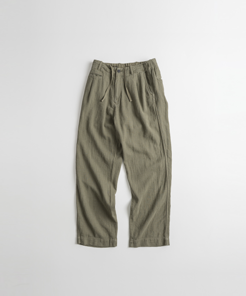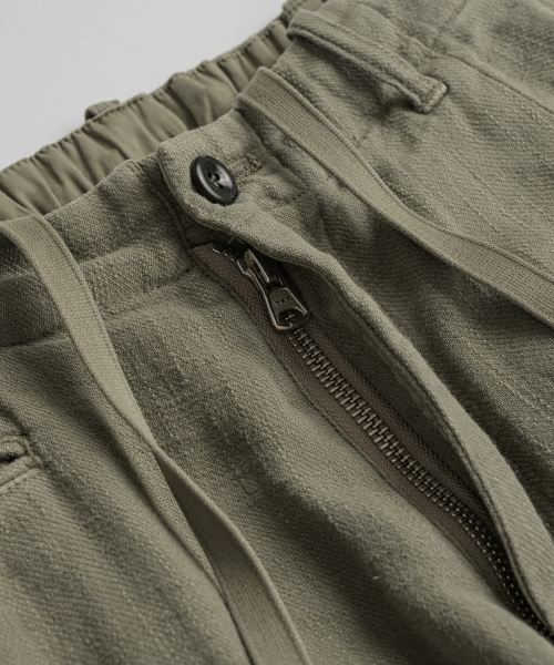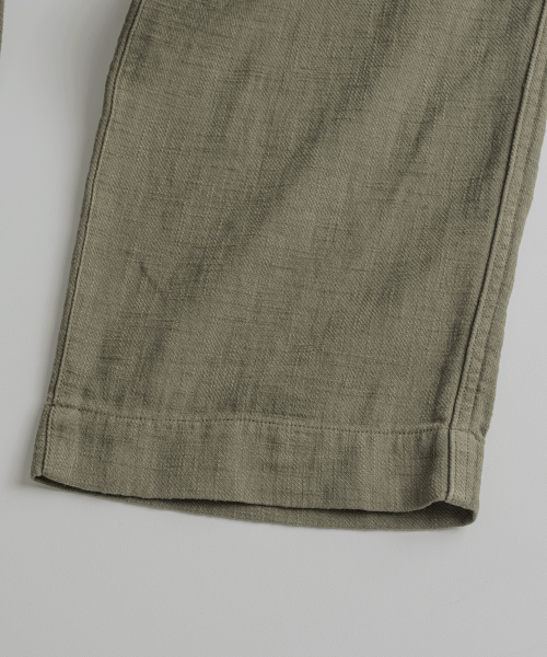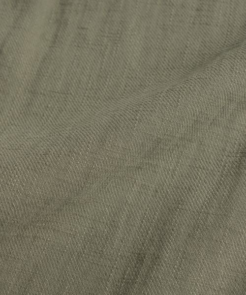 소위 ‘모시’라 불리는 라미(Ramie)와 코튼을 혼방한 패브릭을 사용해, 라미 특유의 거친 슬럽감과 헤어리한 표면 텍스처, 성글게 직조된 조직에서 비롯된 통기성과 공기감 있는 텍스처와 실루엣이 특징입니다.