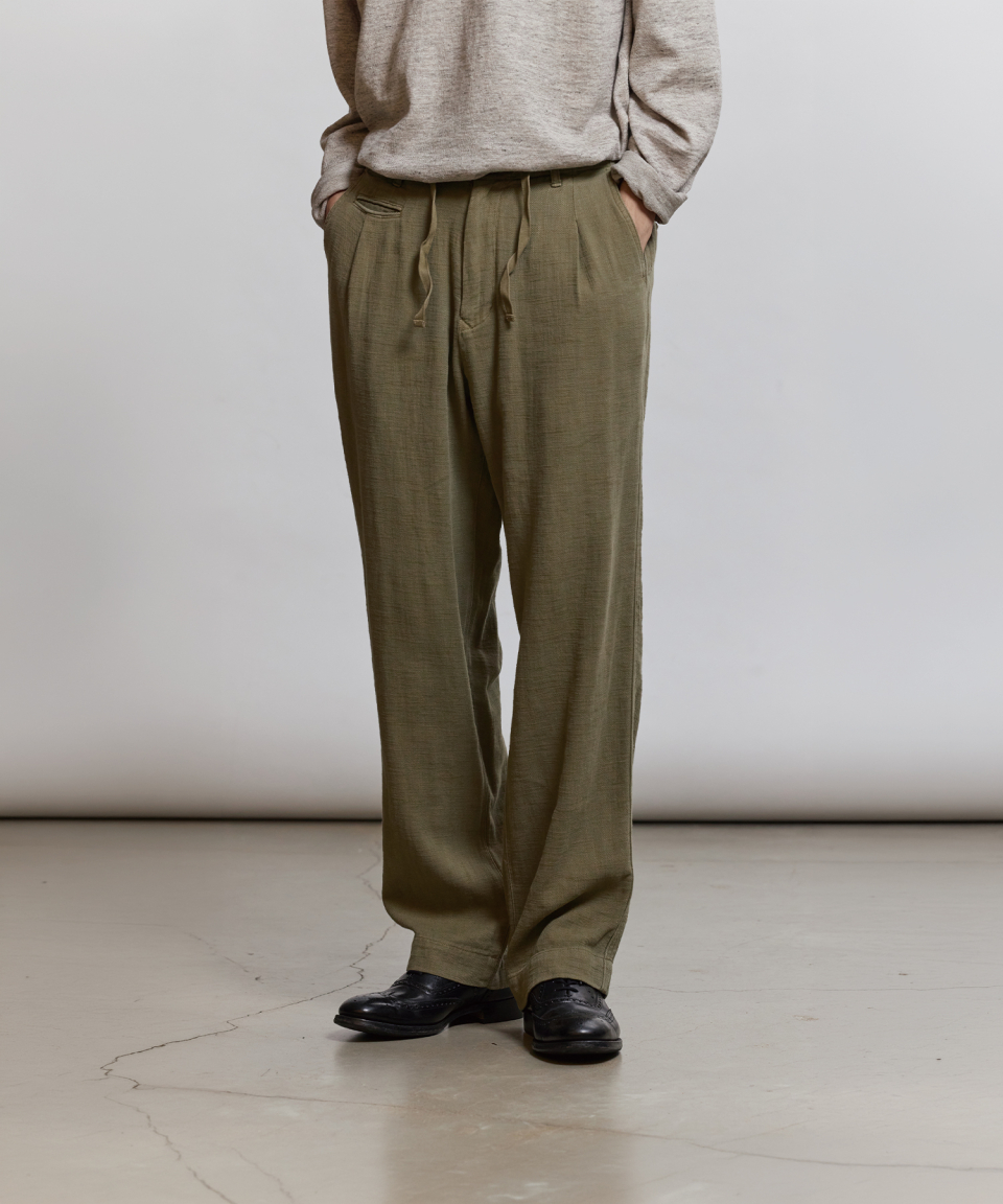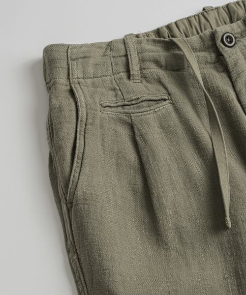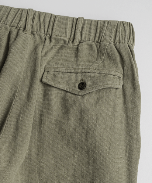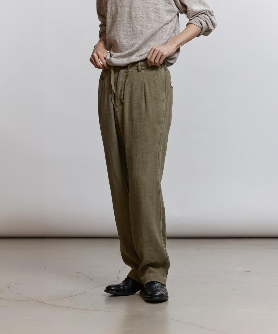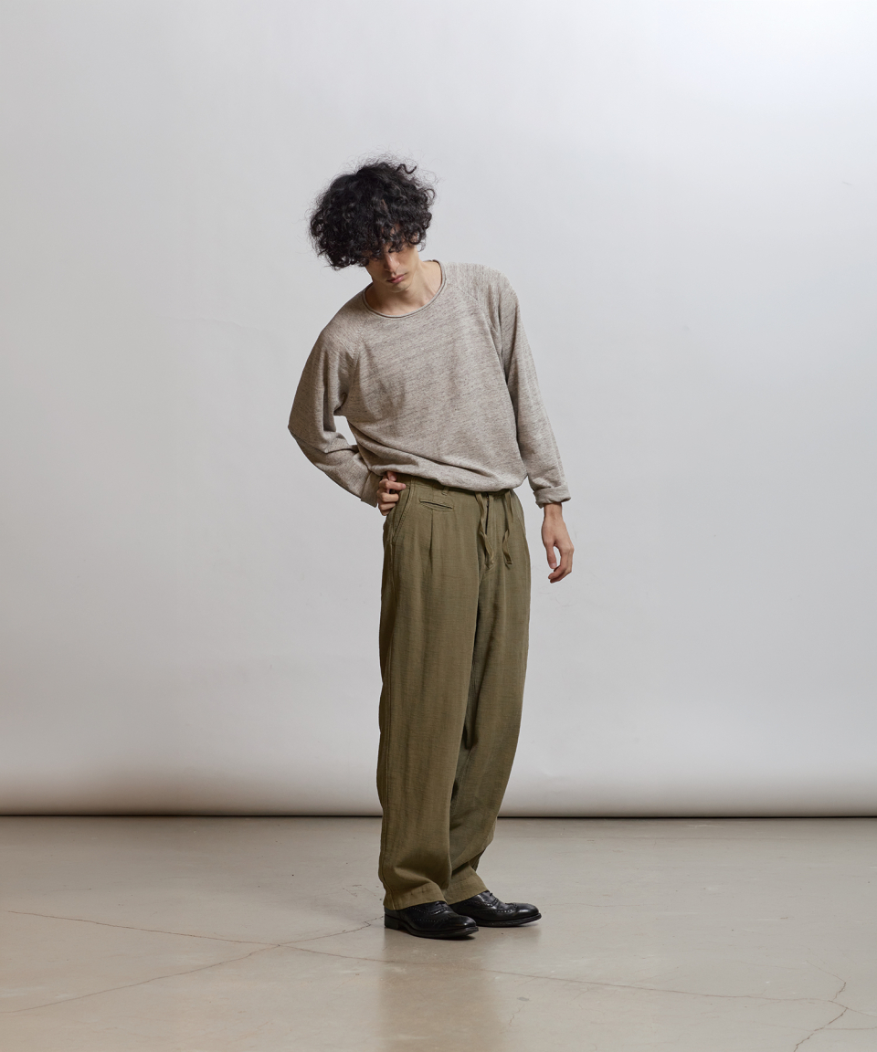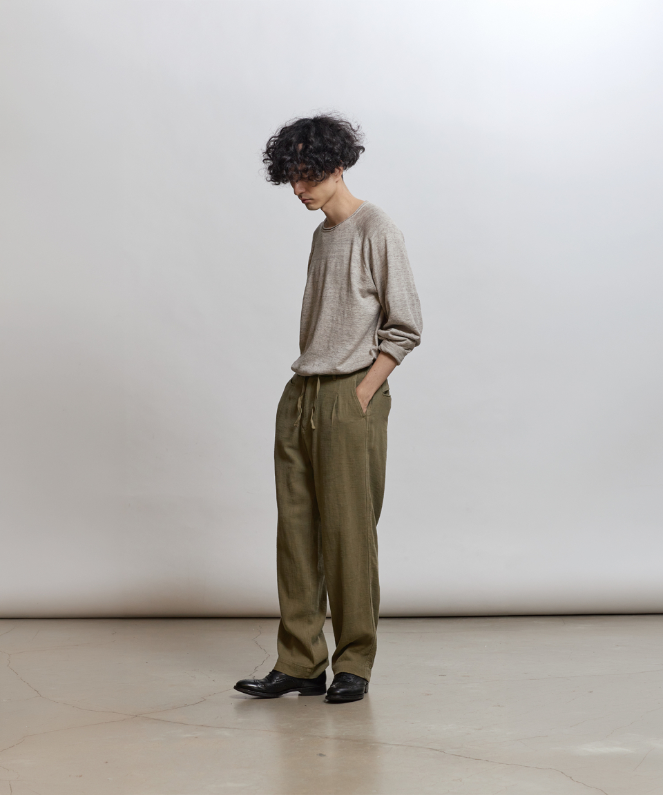 전면에는 깊은 원턱 구조를 적용해 여유로운 실루엣과 함께 라미·코튼 혼방 패브릭 특유의 자연스러운 드레이프가 형성됩니다.