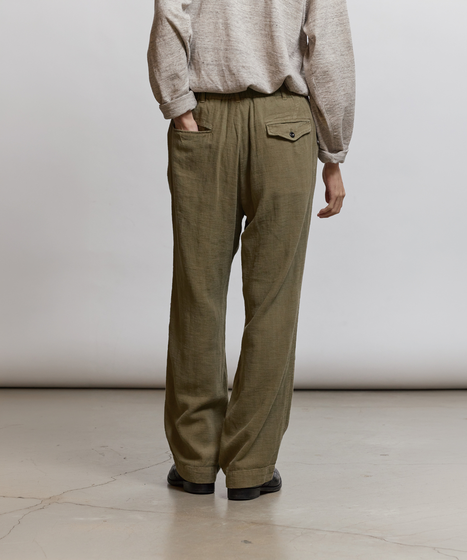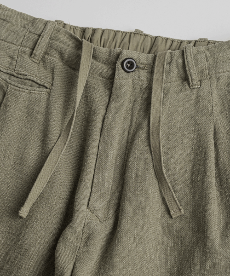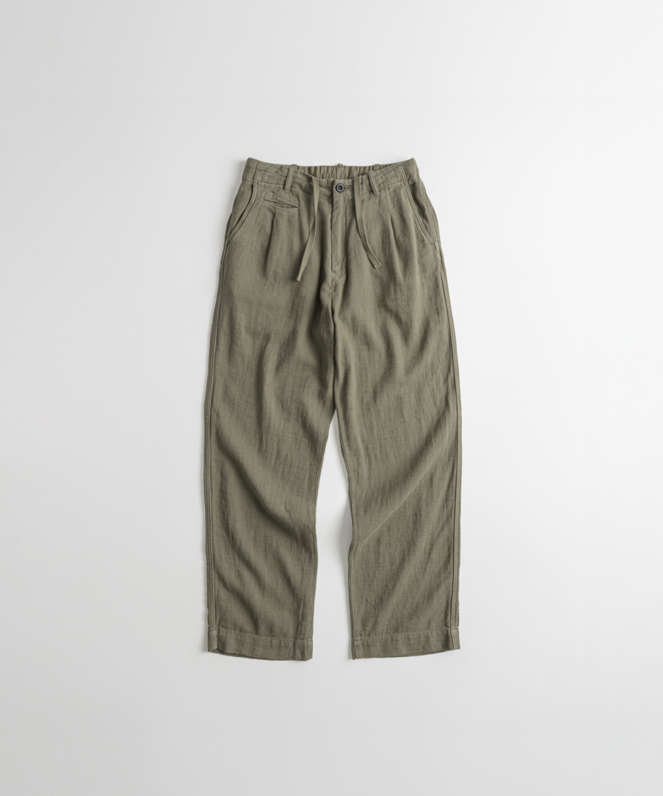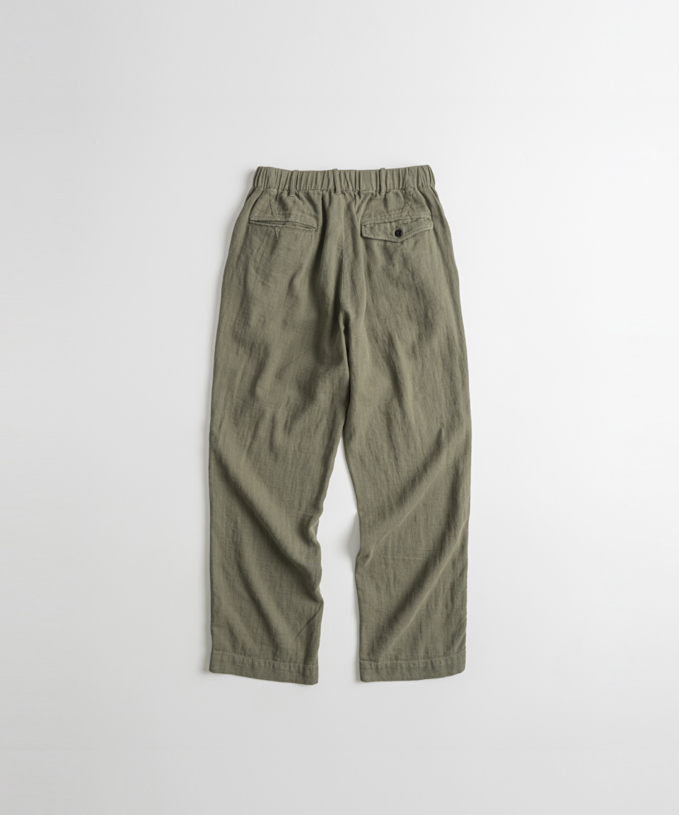 전면에는 깊은 원턱 구조를 적용해 여유로운 실루엣과 함께 라미·코튼 혼방 패브릭 특유의 자연스러운 드레이프가 형성됩니다.