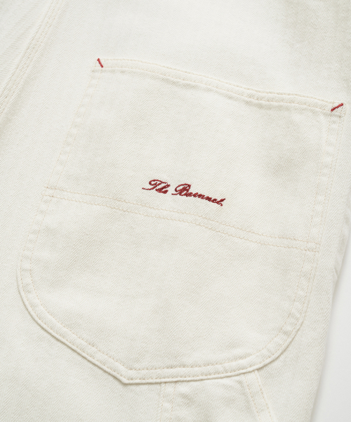 라이트 베이지 컬러의 배색 스티치 사양과 레드 바텍 포인트 디테일
