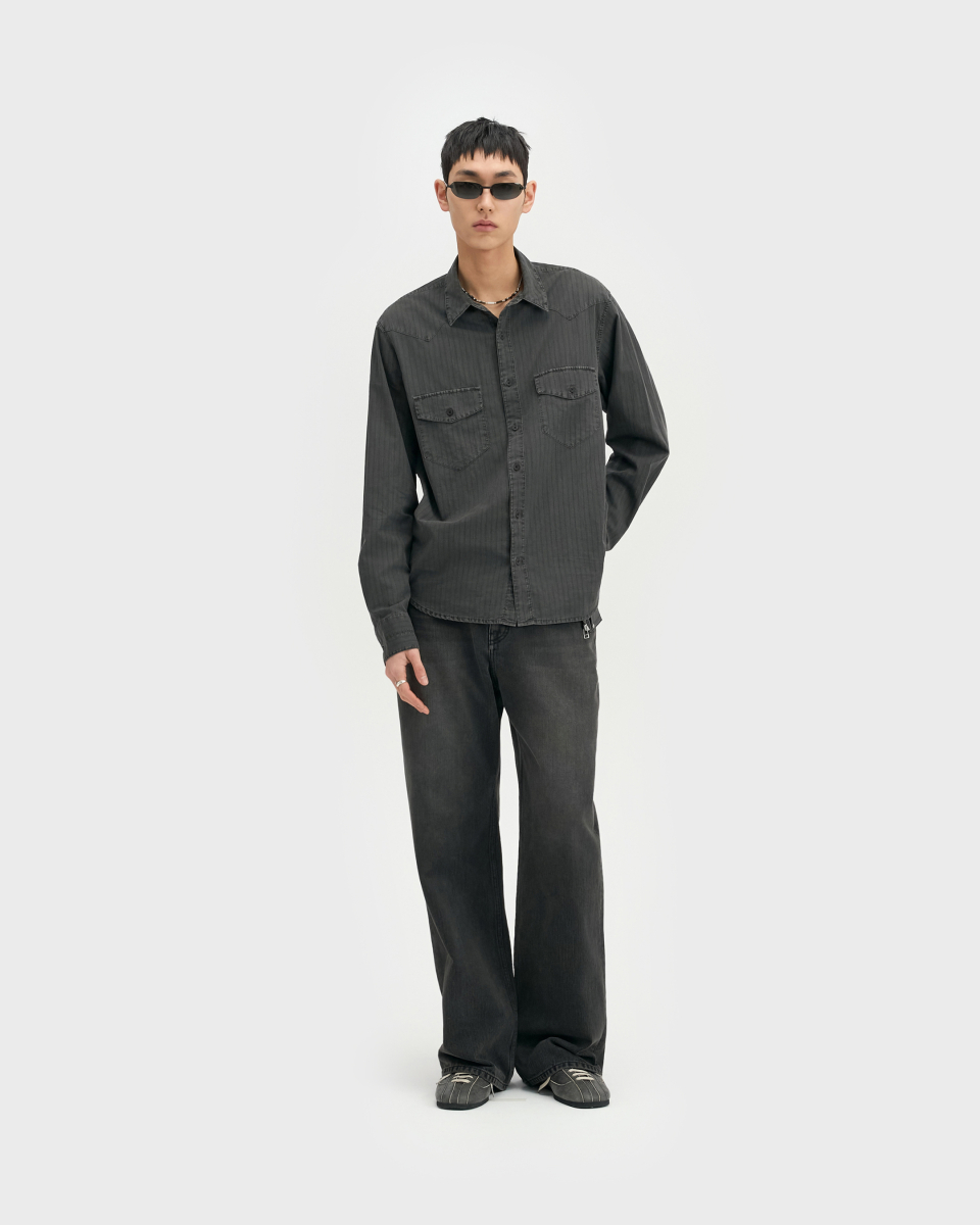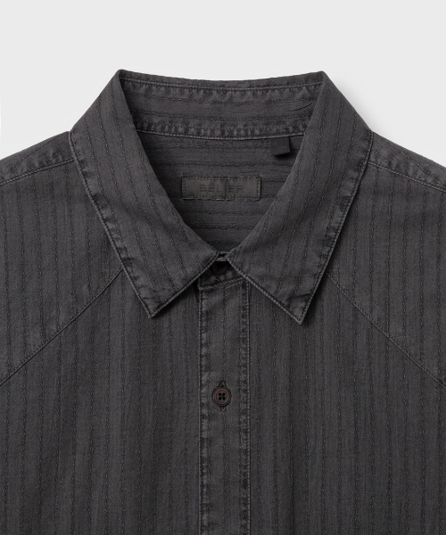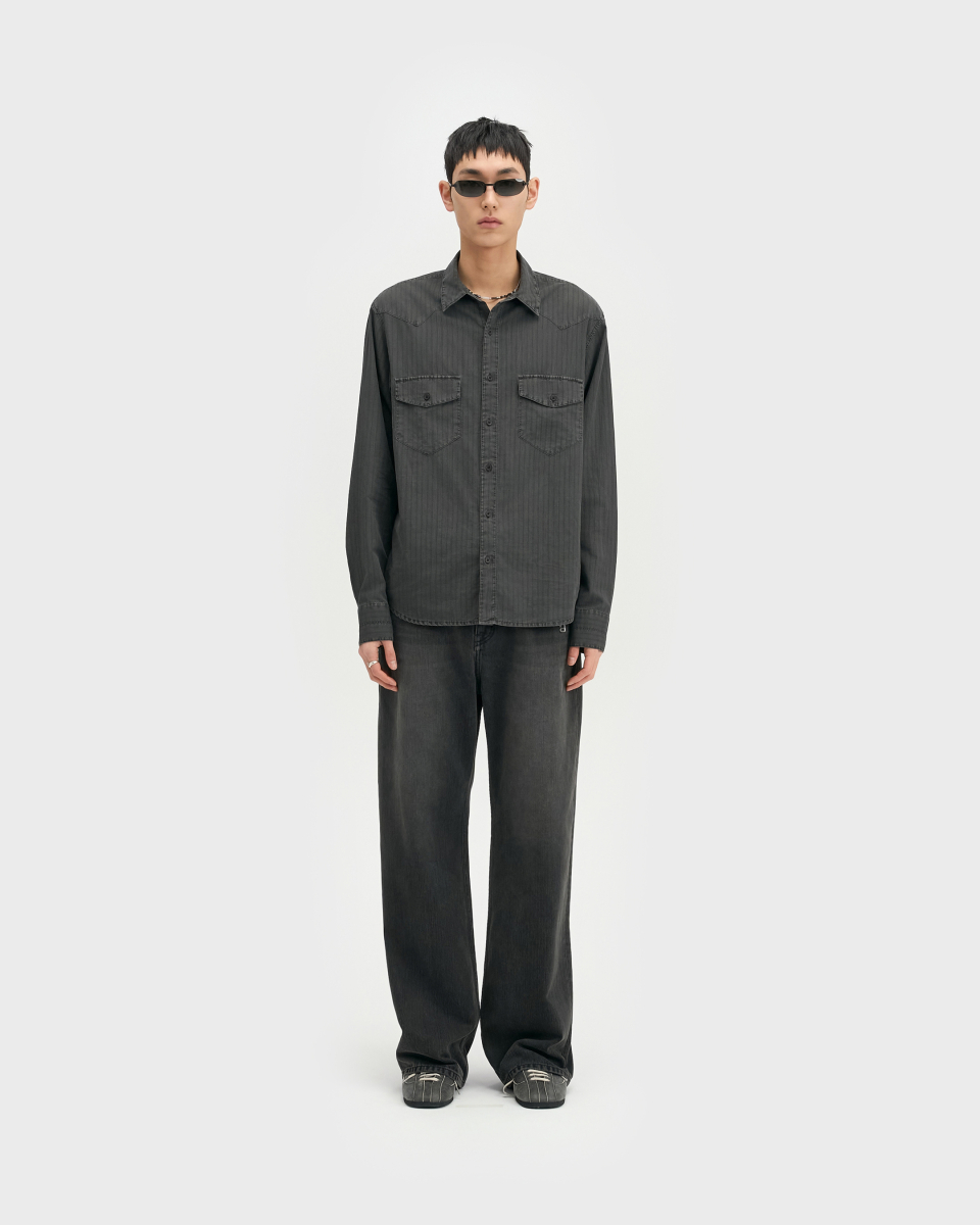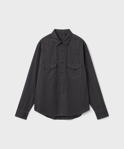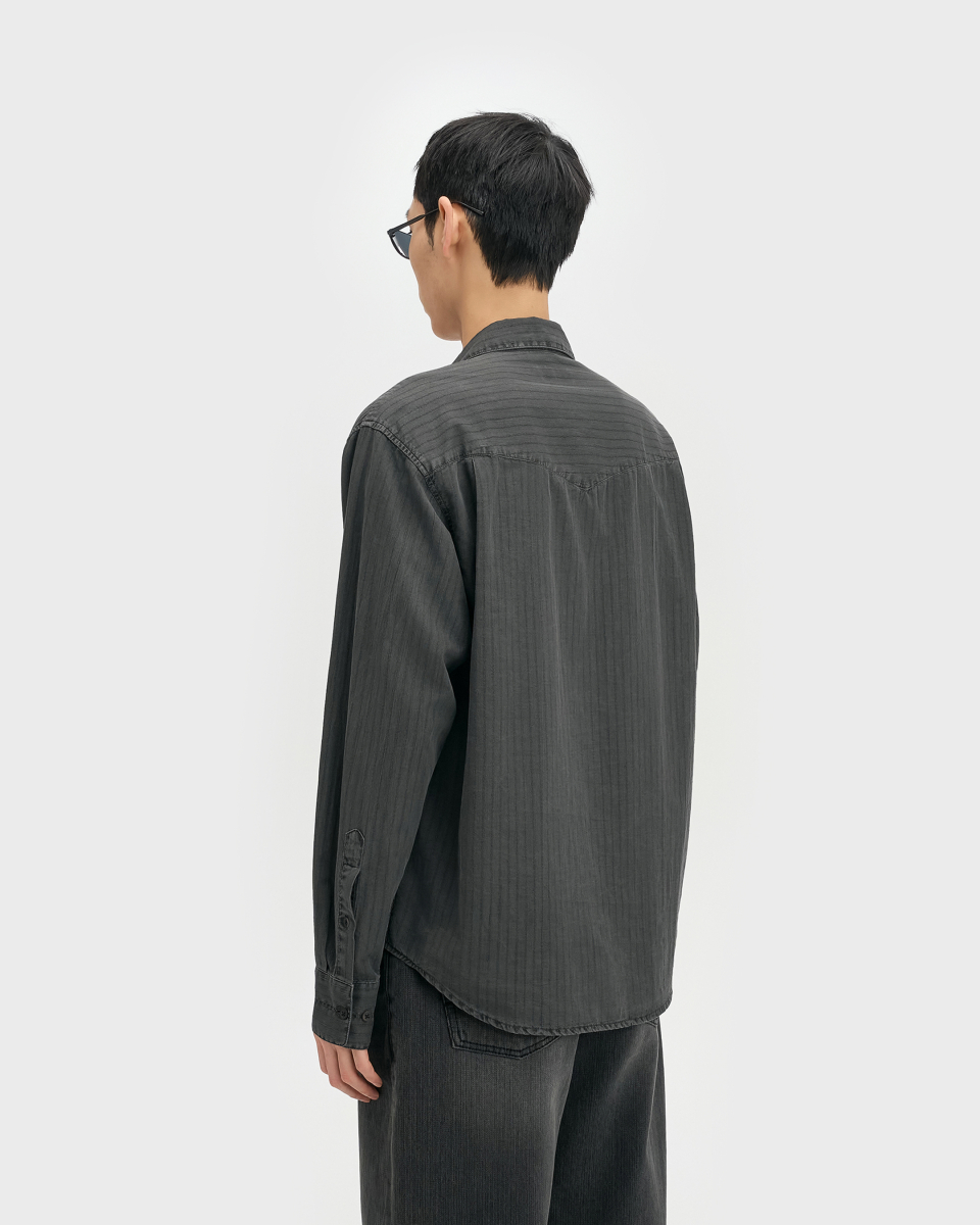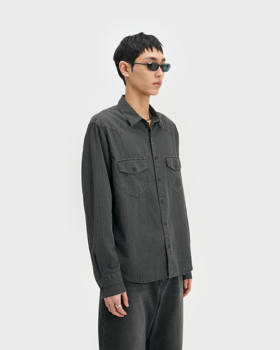 일본 SHUTTLE NOTES社의 고급 자카드 스트라이프 원단을 사용해 인치당 15땀수로 단단하게 제작된 레귤러 핏의 프리미엄 웨스턴 셔츠.