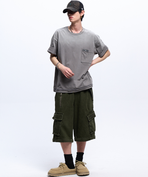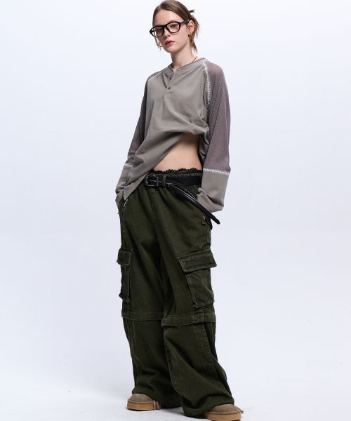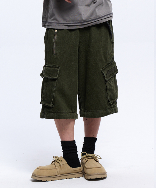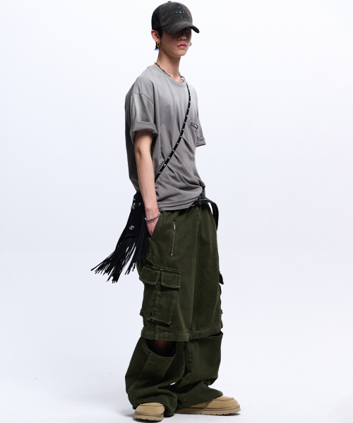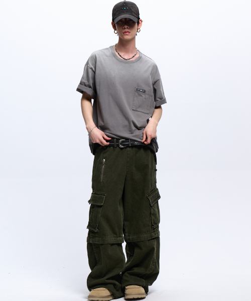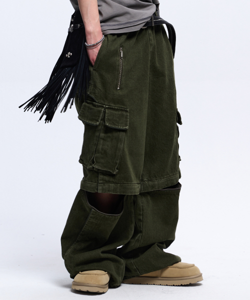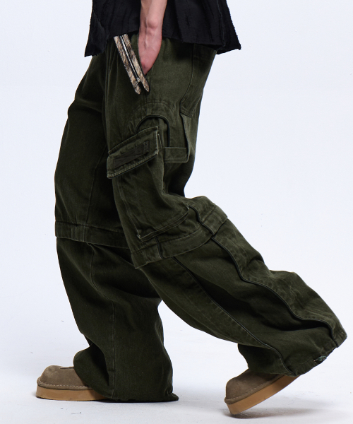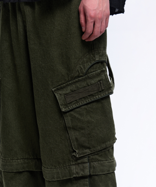 STRIPE MIXED CARGO DENIM PANTS - BLACK