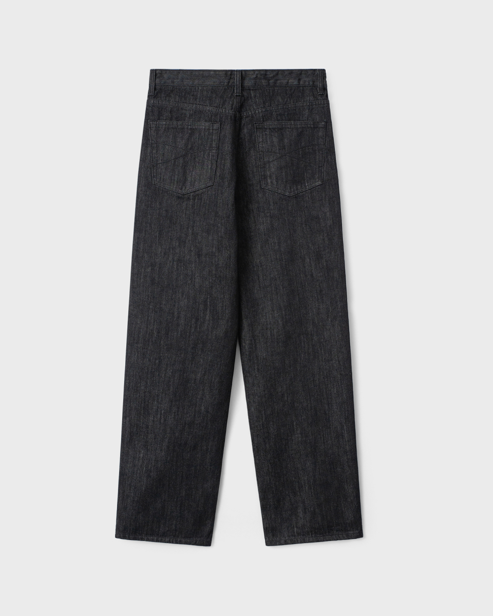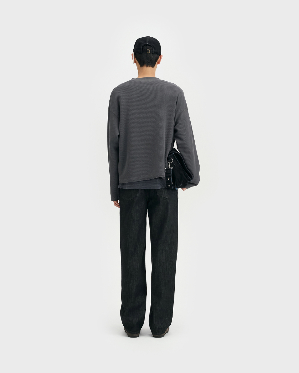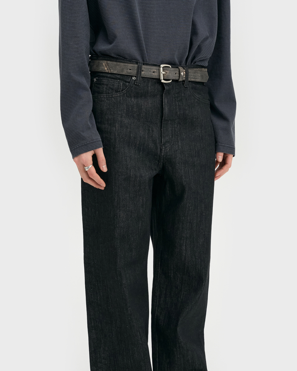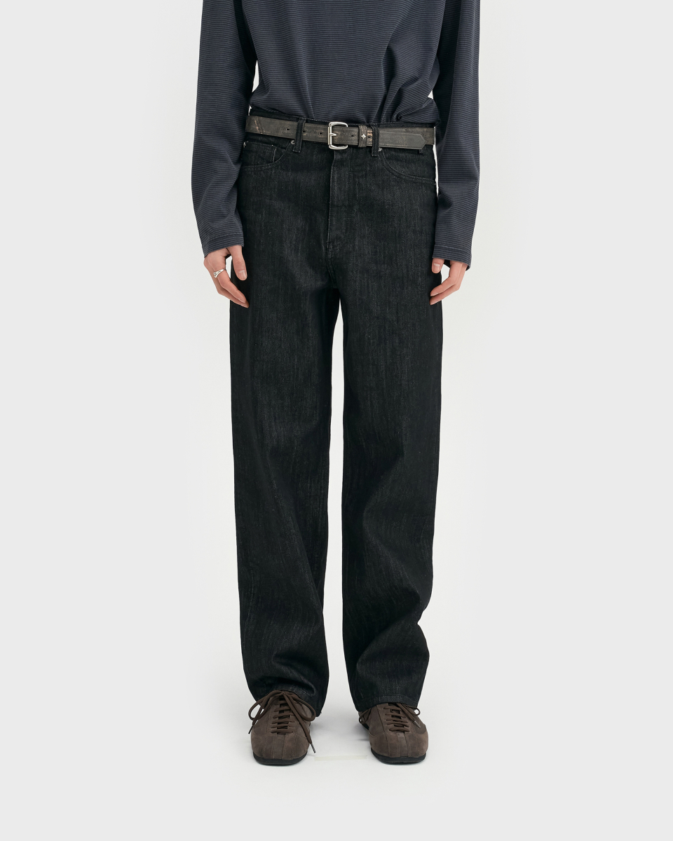 와이드 핏과 테이퍼드 핏의 중간 지점에 해당하는 ‘루즈 테이퍼드 핏‘. 전체적으로 과하지 않은 여유를 유지하면서 안정적으로 테이퍼드되는 실루엣이 특징. 허리 위치는 팬티 라인이 1cm 정도 보이는 위치가 적당하며, 밑단은 뒷꿈치에 걸려 적당히 쌓이도록 설계.