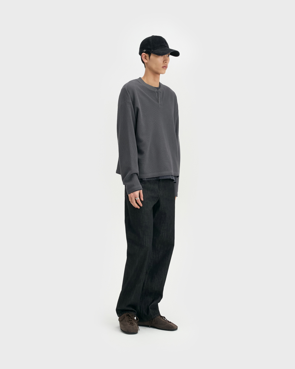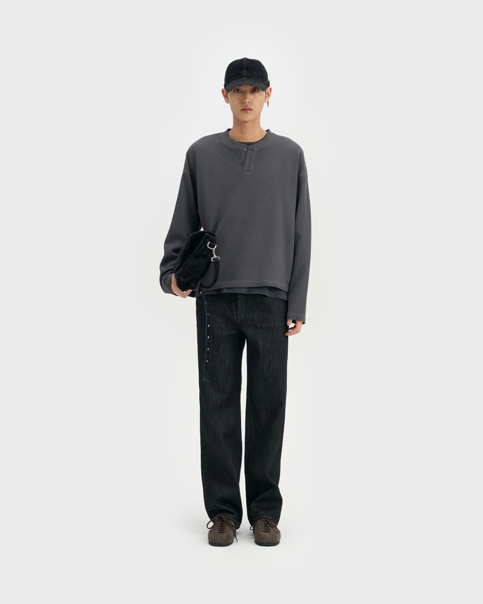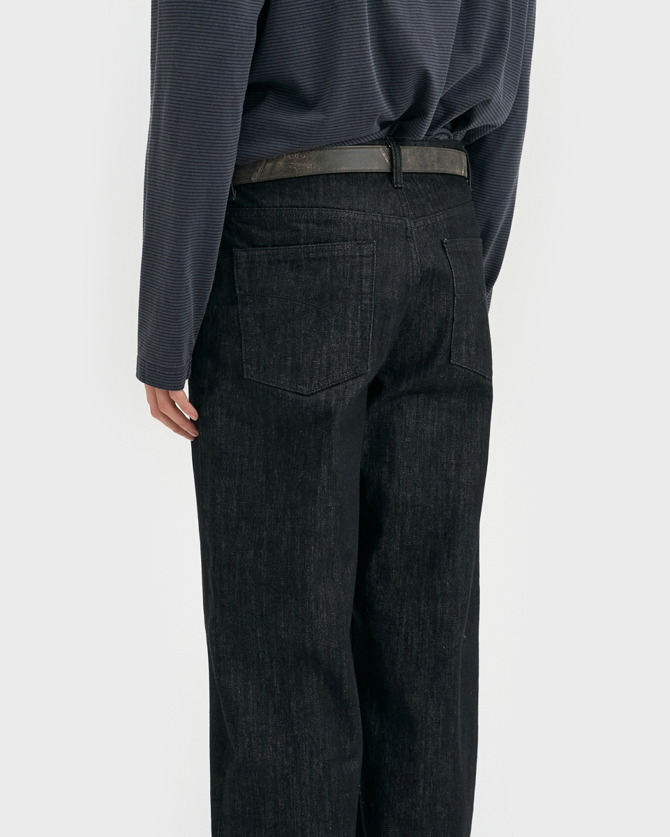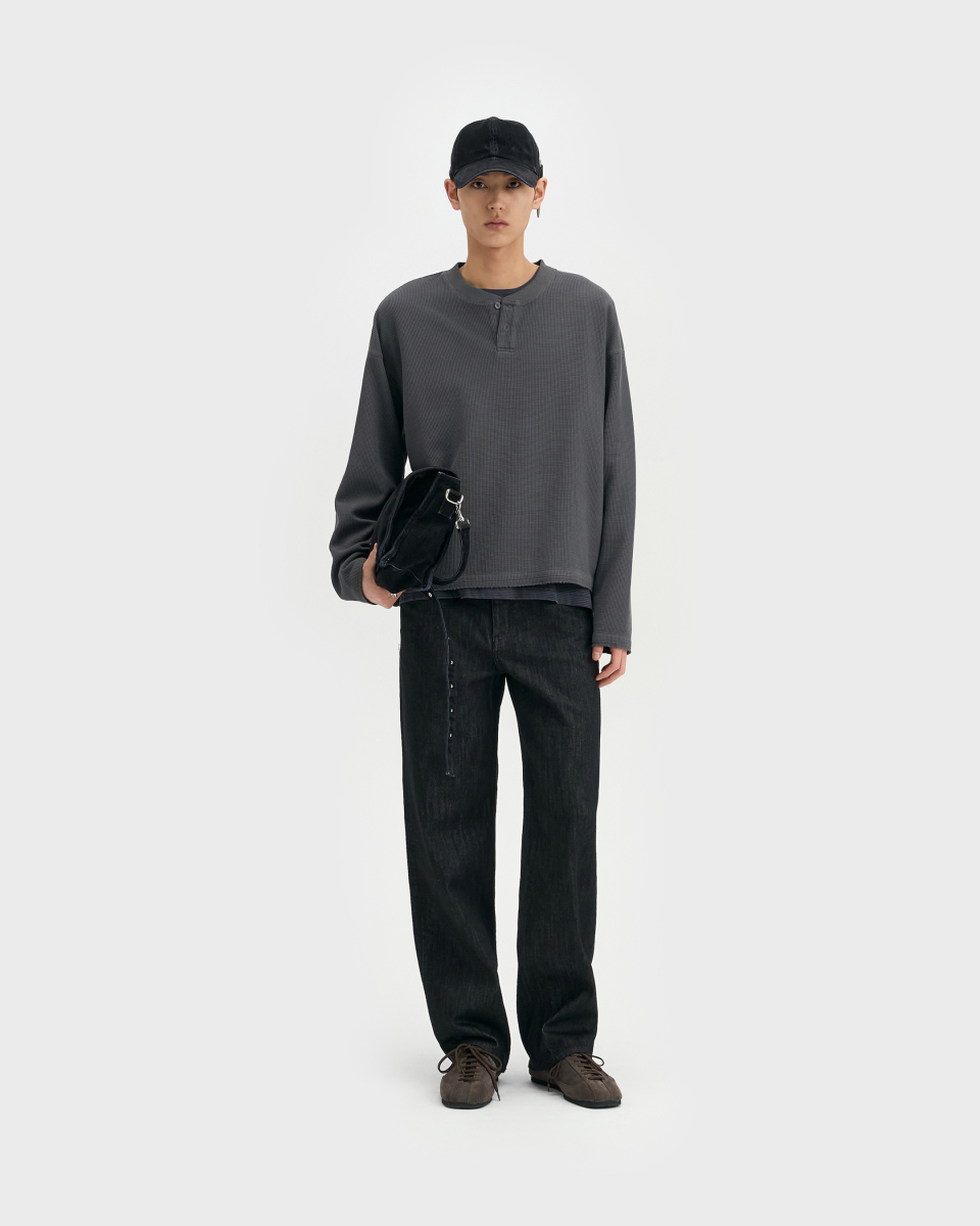 와이드 핏과 테이퍼드 핏의 중간 지점에 해당하는 ‘루즈 테이퍼드 핏‘. 전체적으로 과하지 않은 여유를 유지하면서 안정적으로 테이퍼드되는 실루엣이 특징. 허리 위치는 팬티 라인이 1cm 정도 보이는 위치가 적당하며, 밑단은 뒷꿈치에 걸려 적당히 쌓이도록 설계.