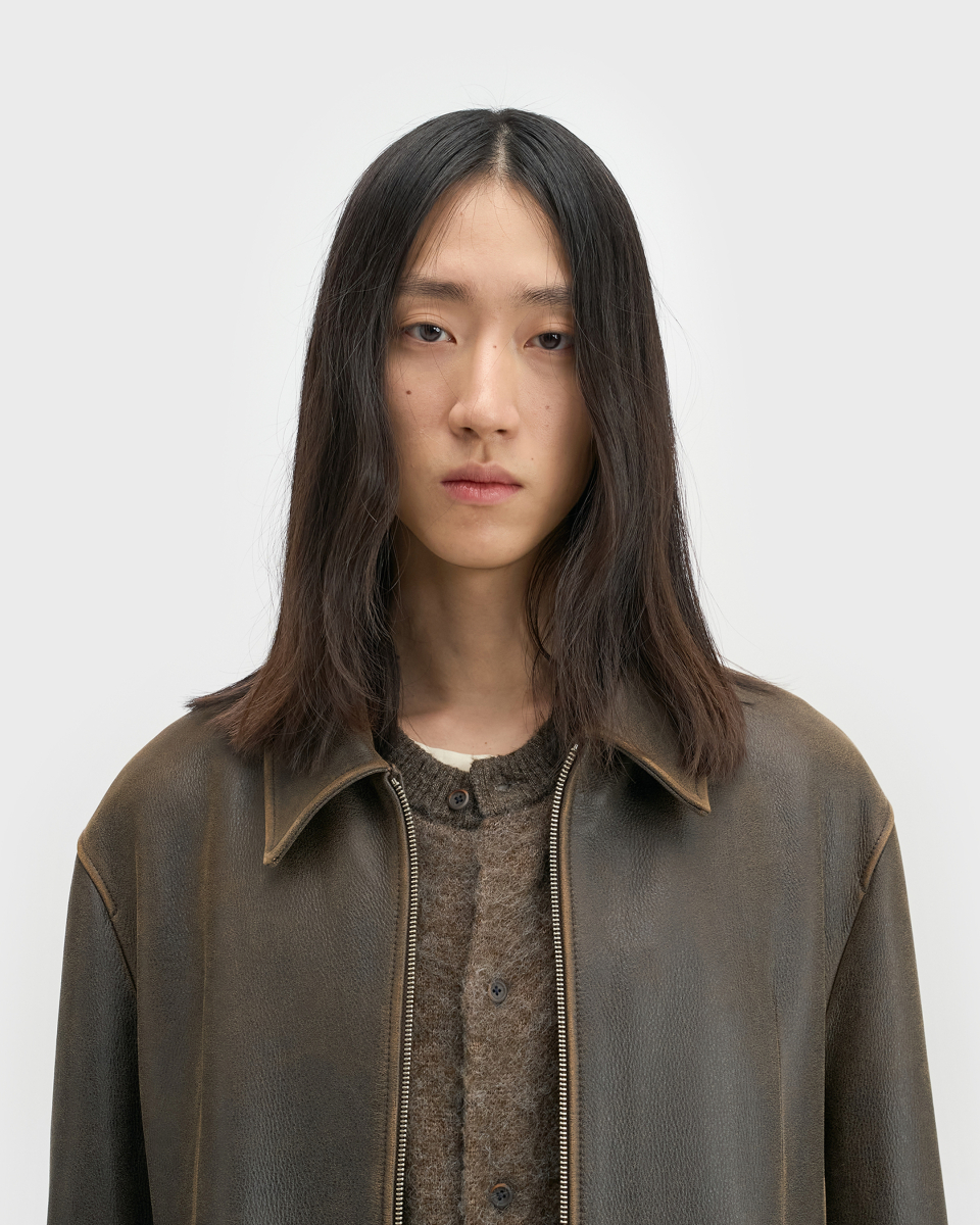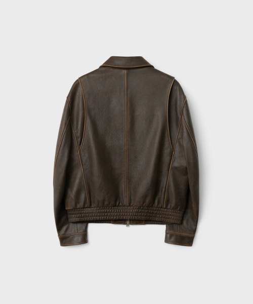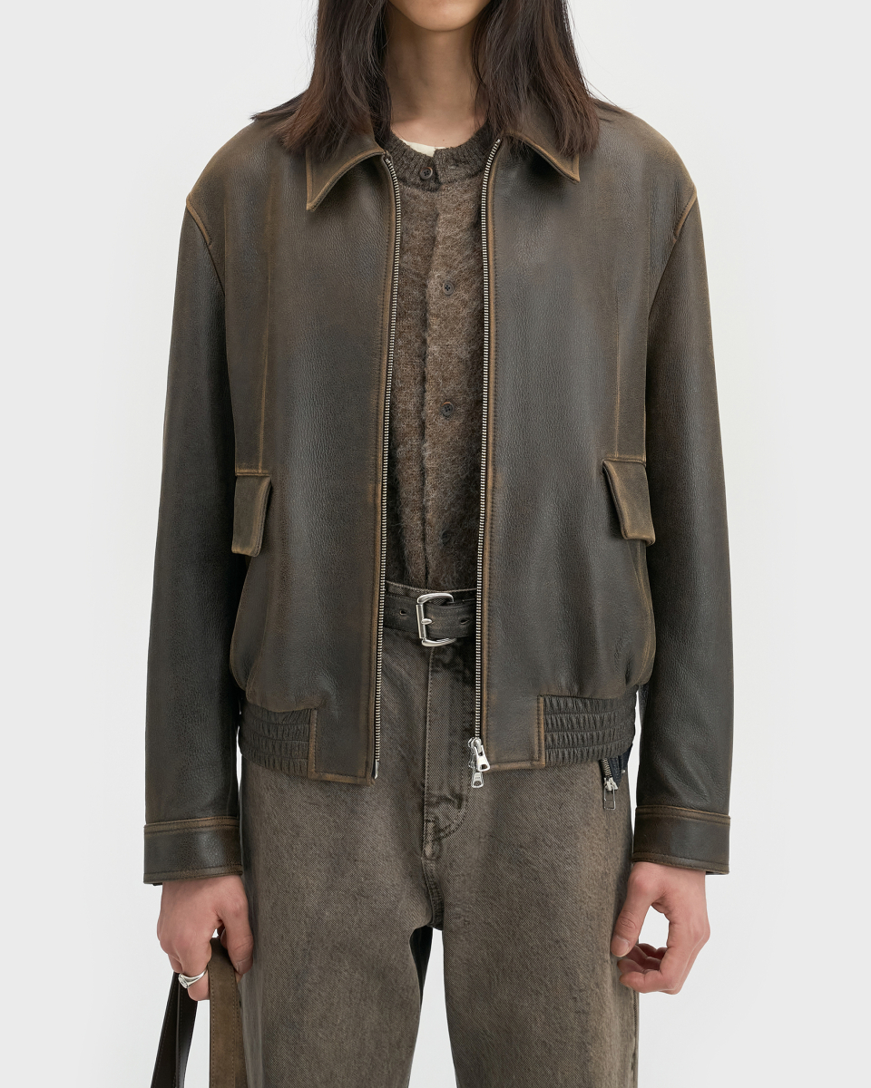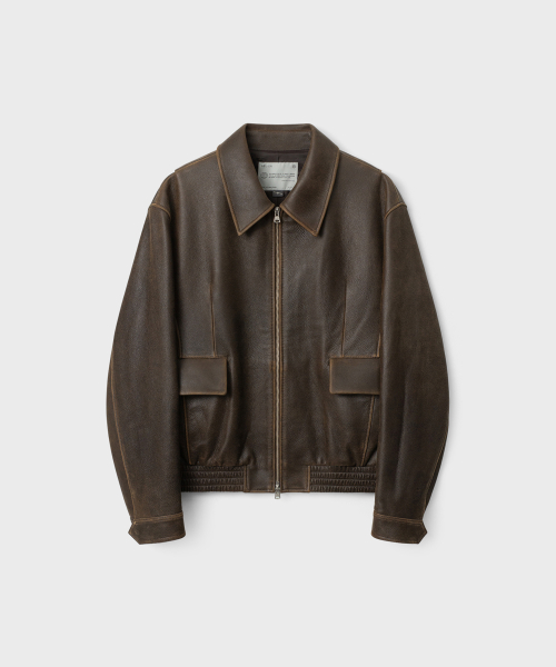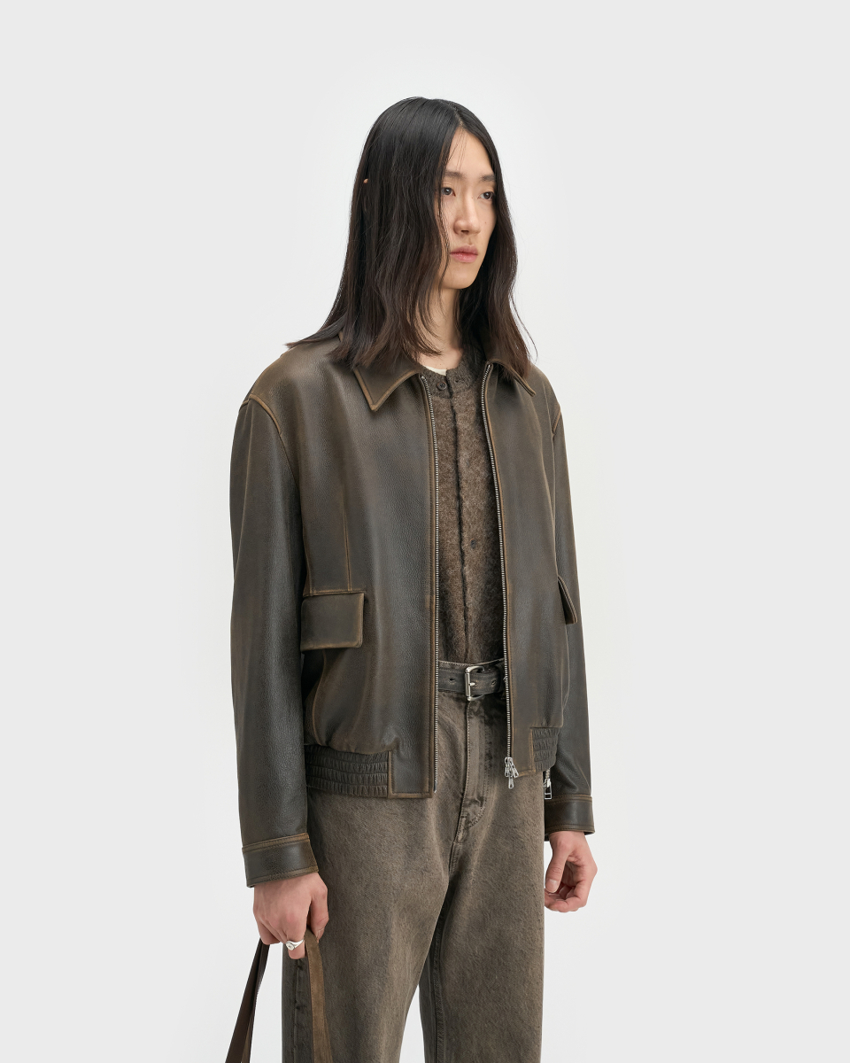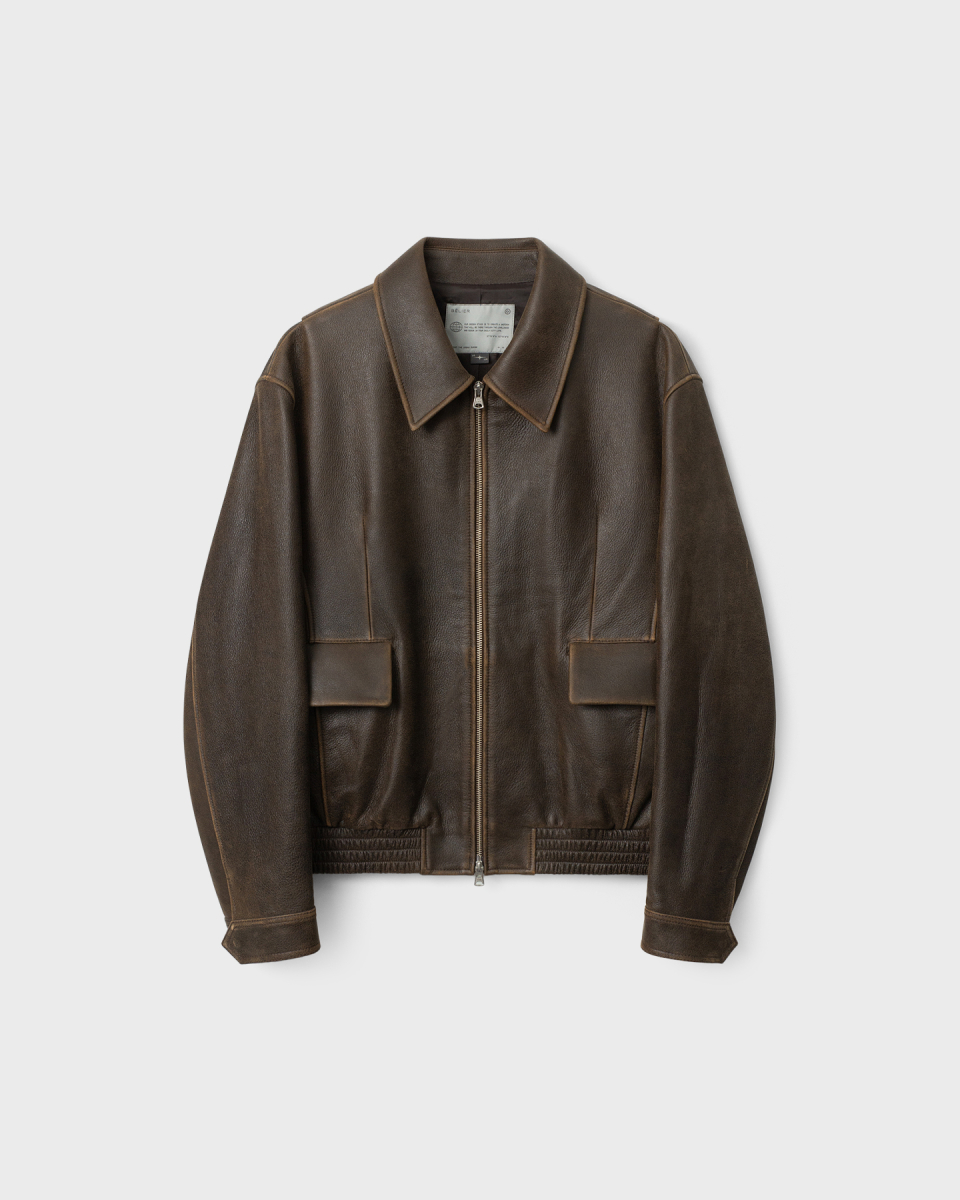 국내산 소가죽에 샌딩 가공을 더해 빈티지하게 재해석한 블루종. 크롭한 기장과 정제된 절개 라인이 담백한 인상을 주며, 착용할수록 깊어지는 가죽 본연의 질감 변화가 특징인 제품.