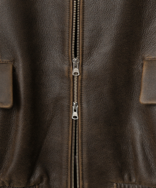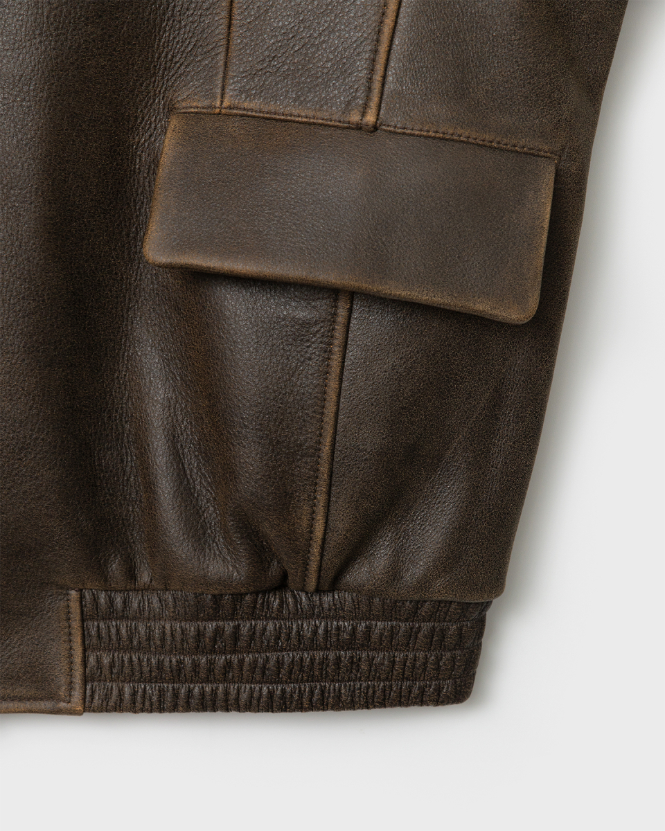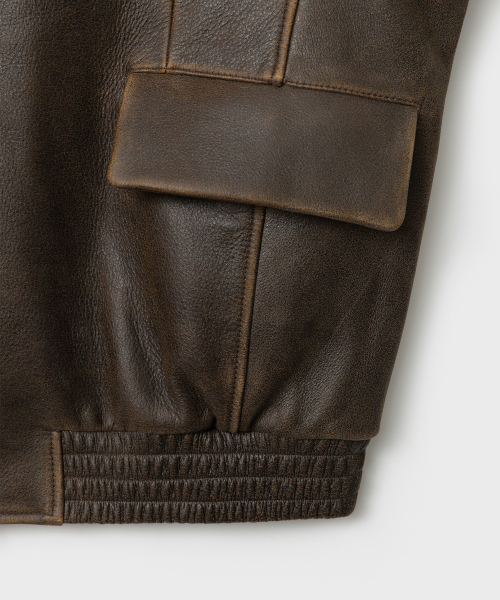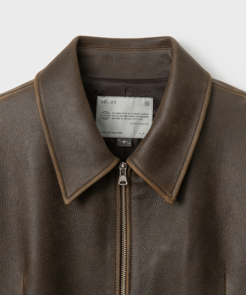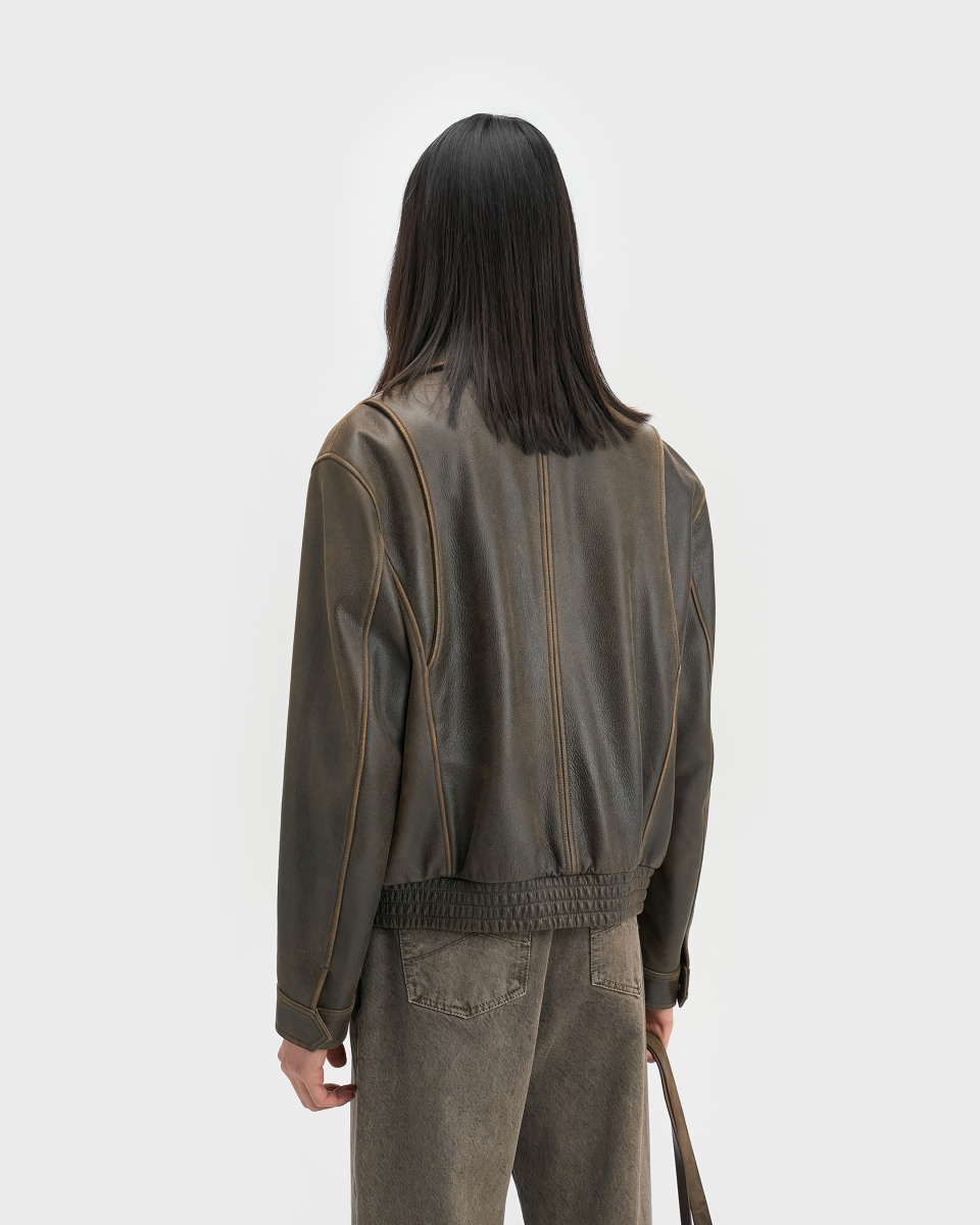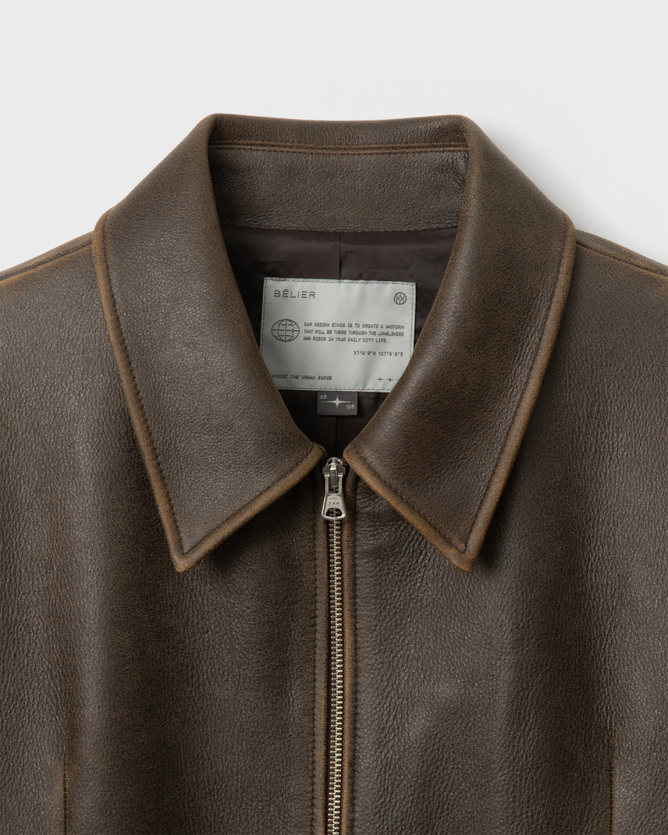 국내산 소가죽에 샌딩 가공을 더해 빈티지하게 재해석한 블루종. 크롭한 기장과 정제된 절개 라인이 담백한 인상을 주며, 착용할수록 깊어지는 가죽 본연의 질감 변화가 특징인 제품.