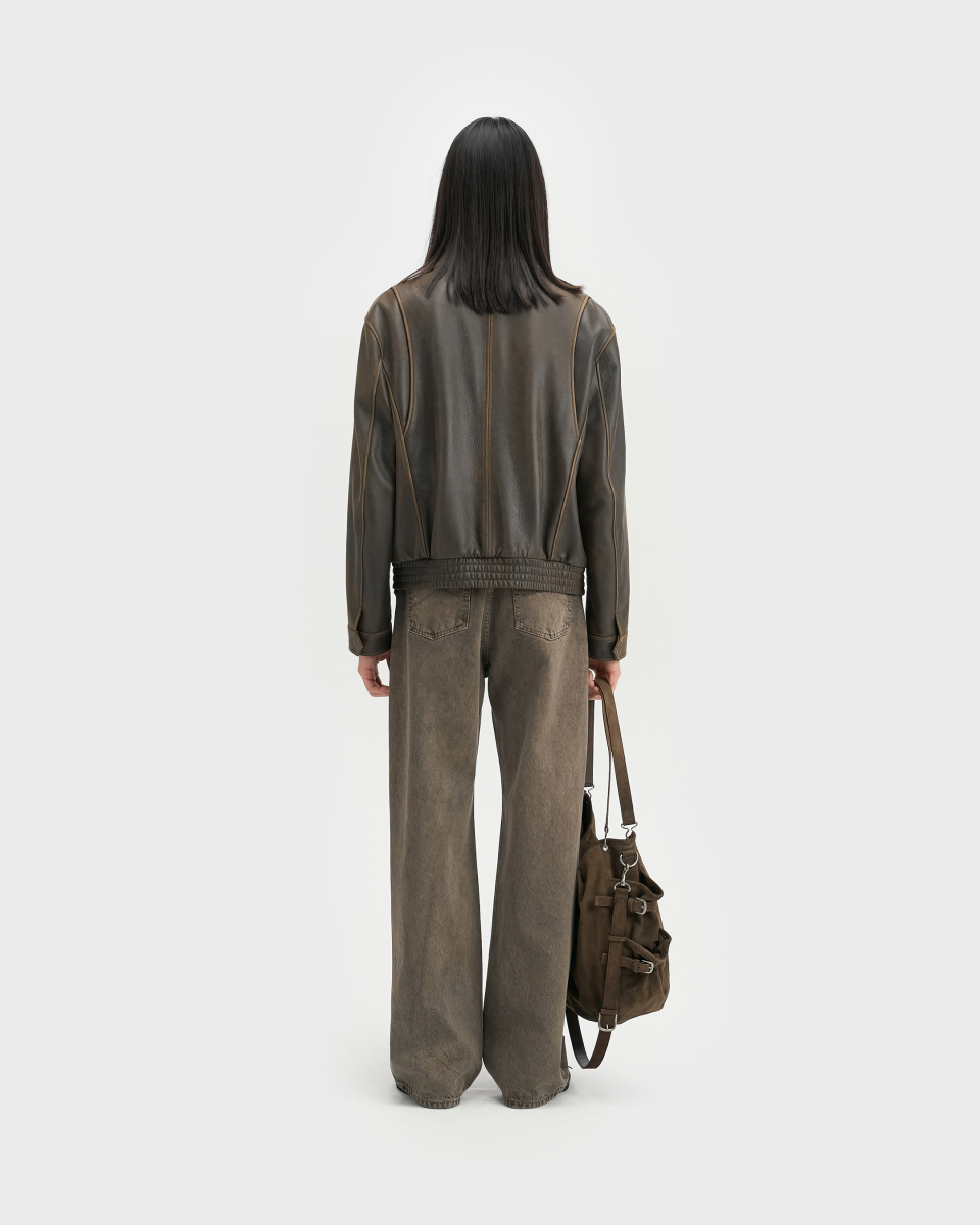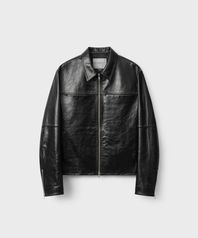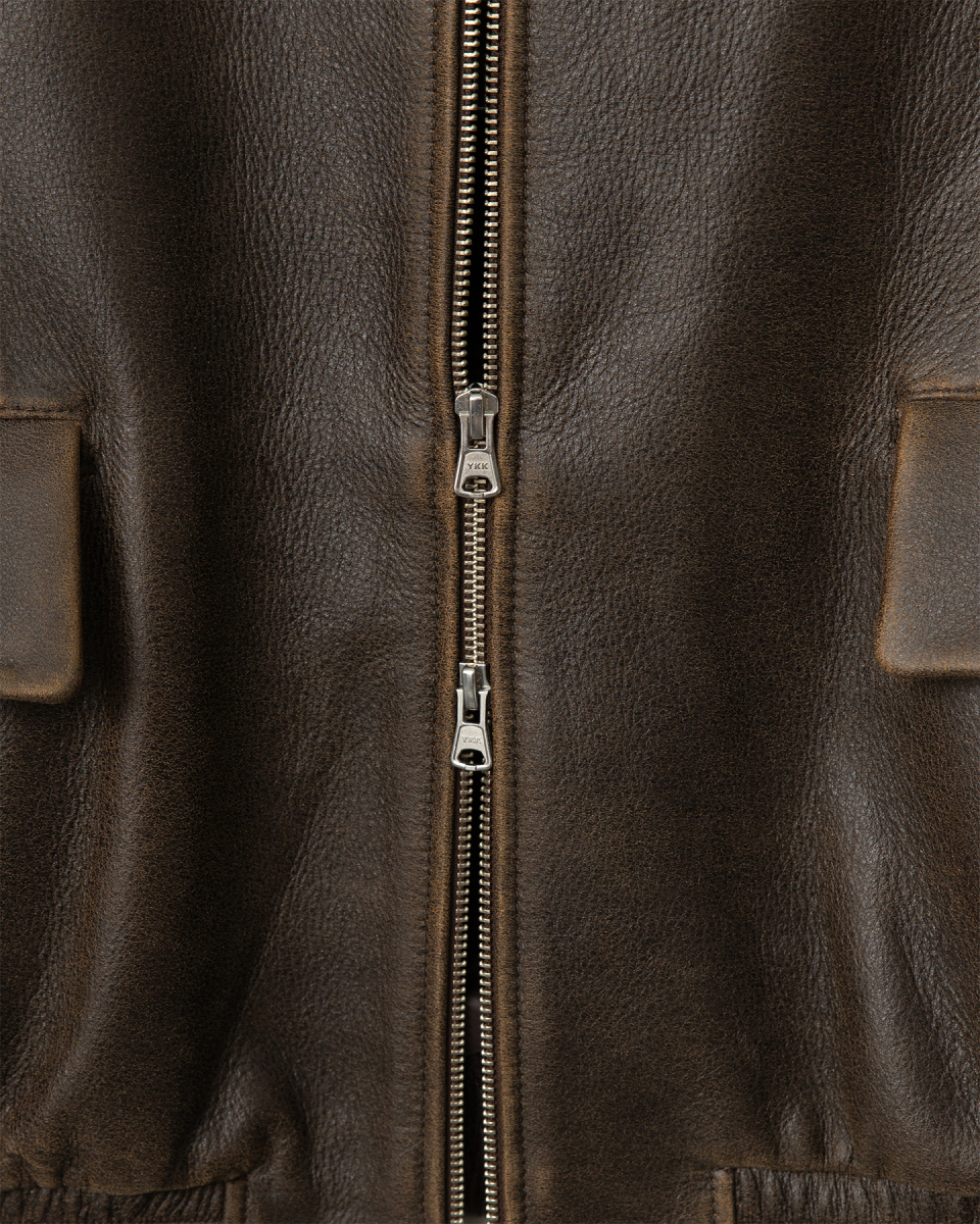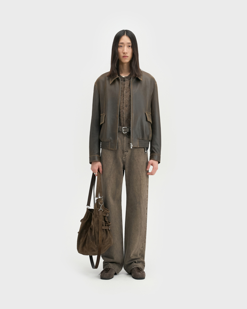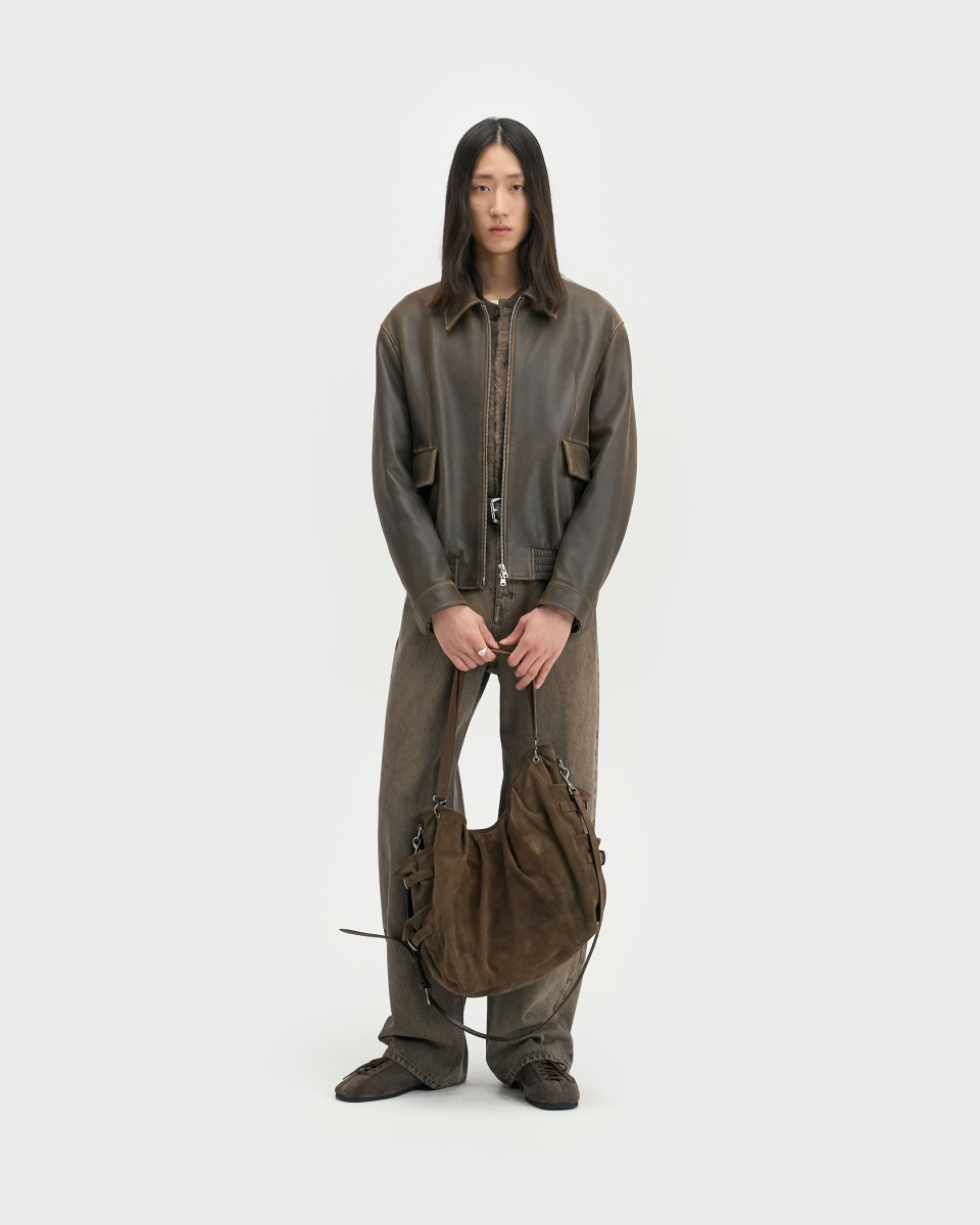 국내산 소가죽에 샌딩 가공을 더해 빈티지하게 재해석한 블루종. 크롭한 기장과 정제된 절개 라인이 담백한 인상을 주며, 착용할수록 깊어지는 가죽 본연의 질감 변화가 특징인 제품.