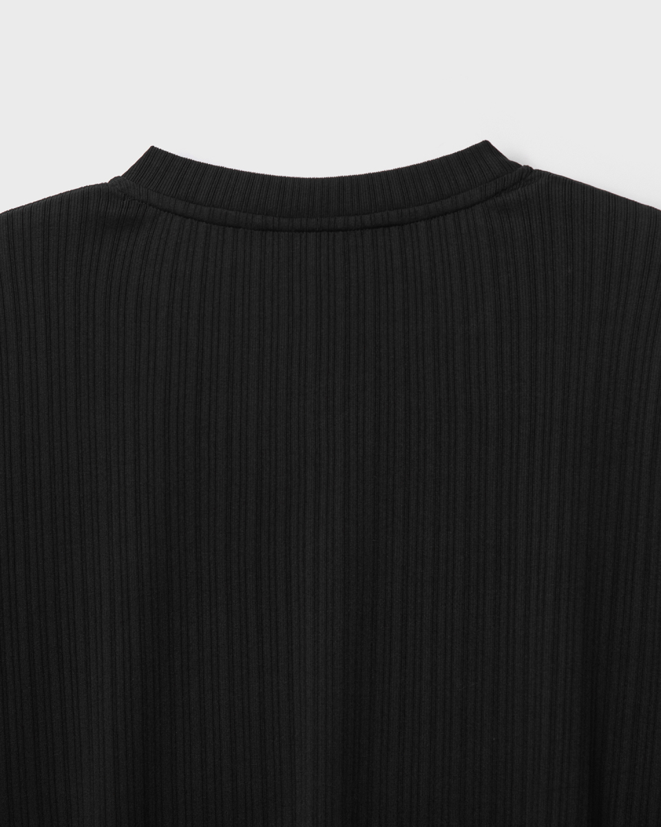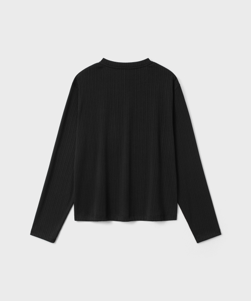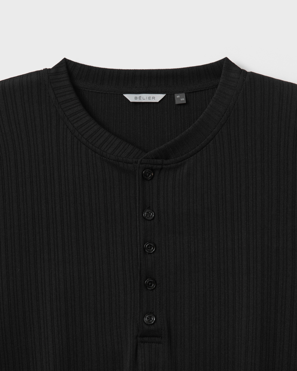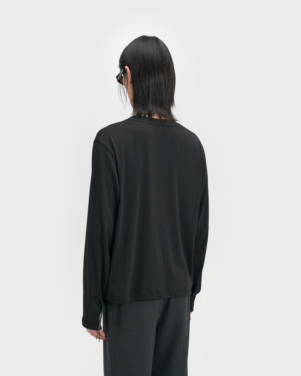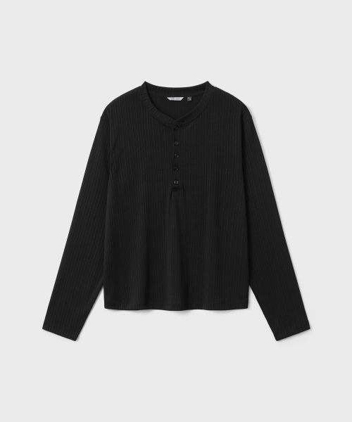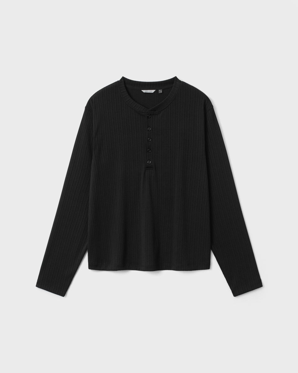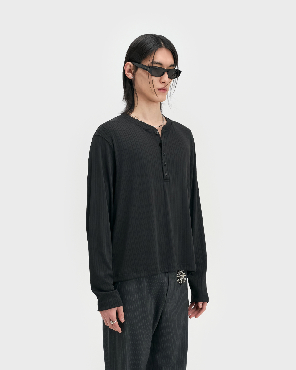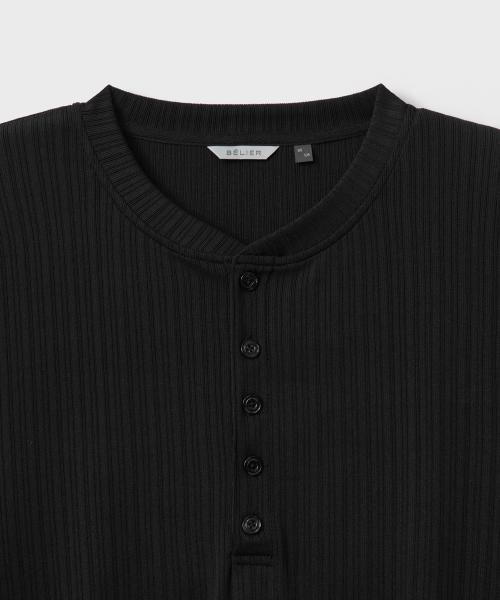 은은한 광택과 불규칙한 골지 텍스처가 돋보이는 헨리넥 티셔츠. 유연한 소재감이 편안한 착용감을 제공하며, 도시적인 선을 닮은 조직감이 단품은 물론 이너로서 정제된 무드를 완성하는 제품.