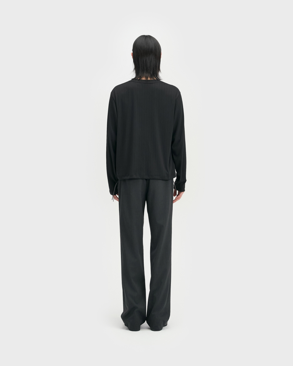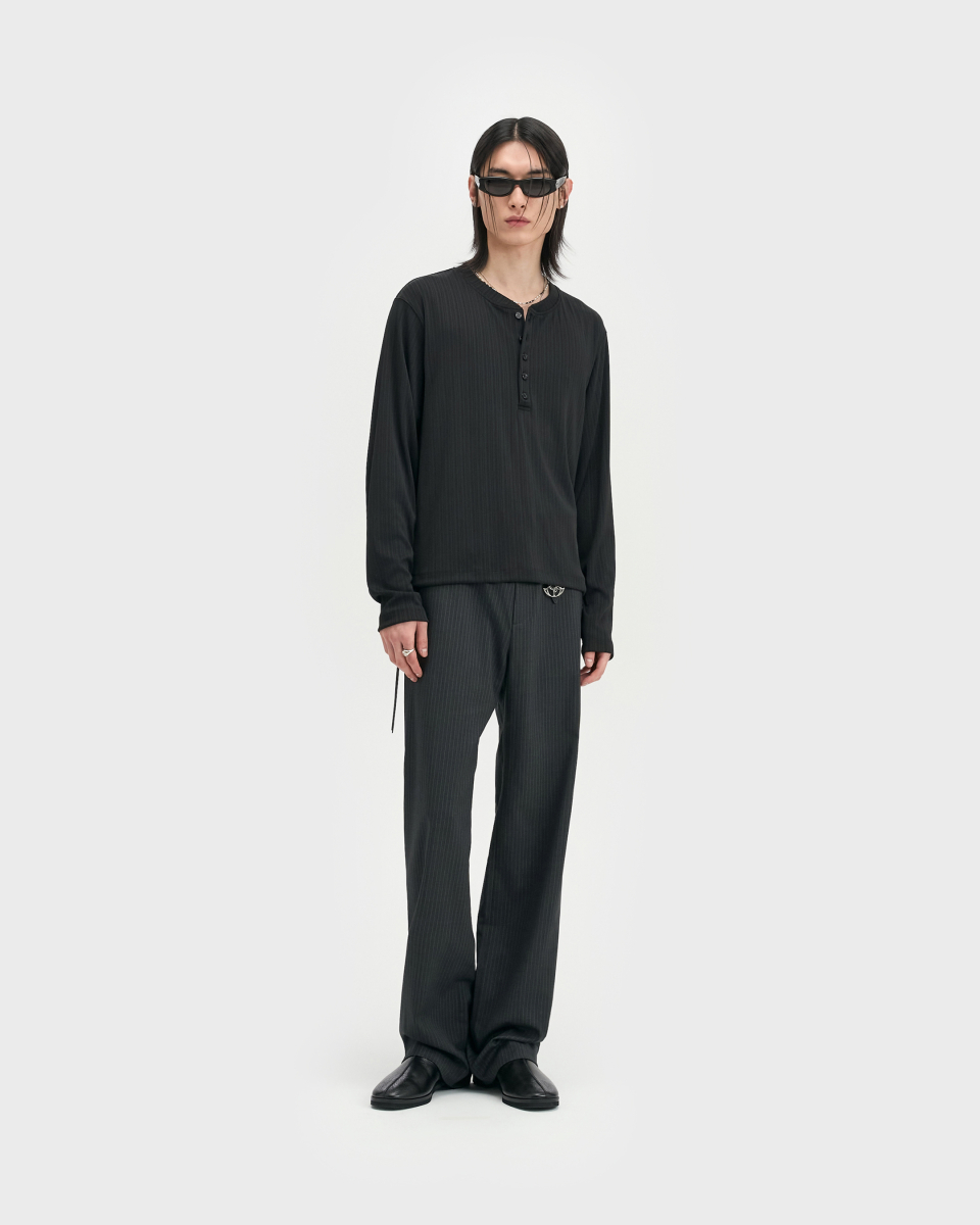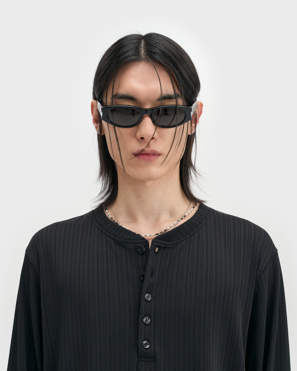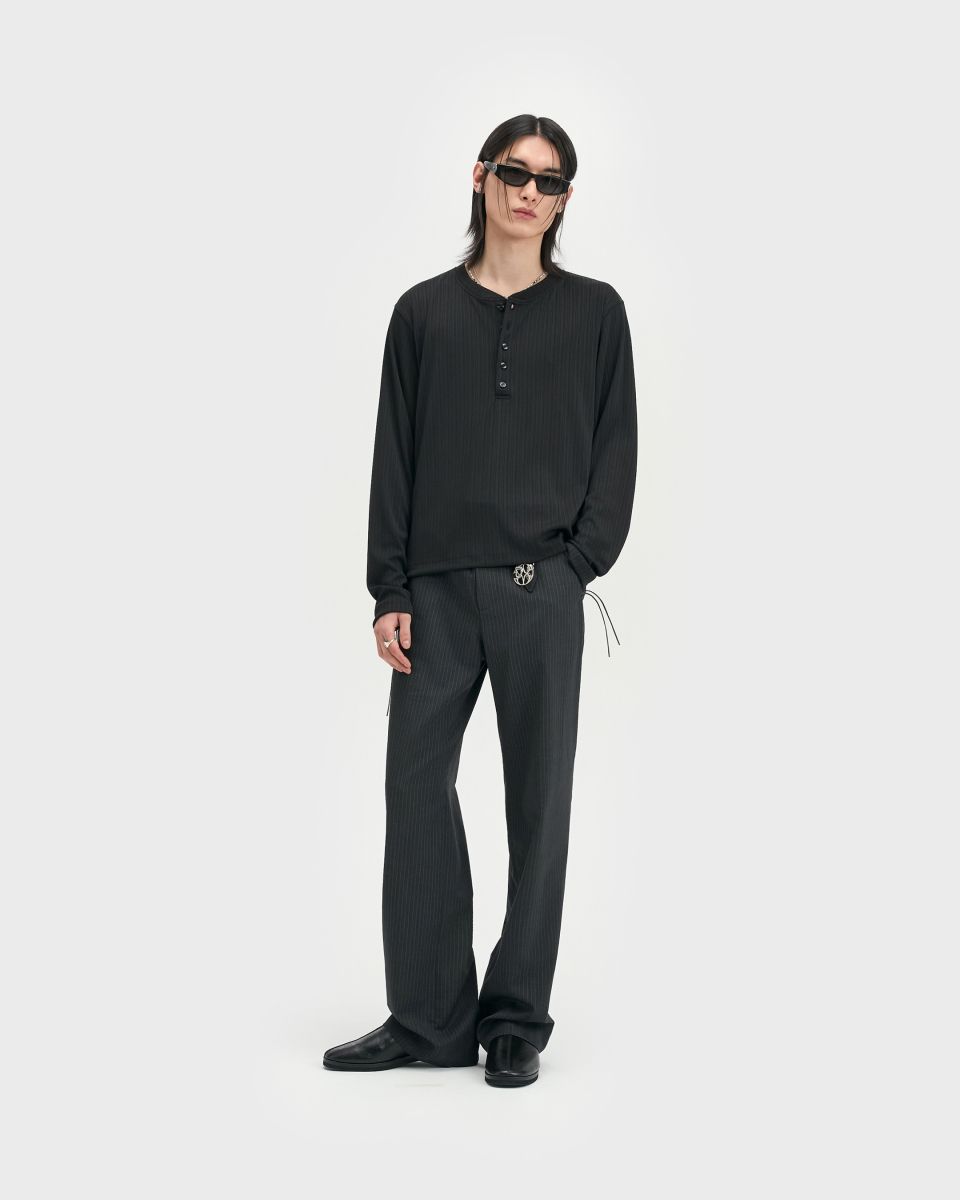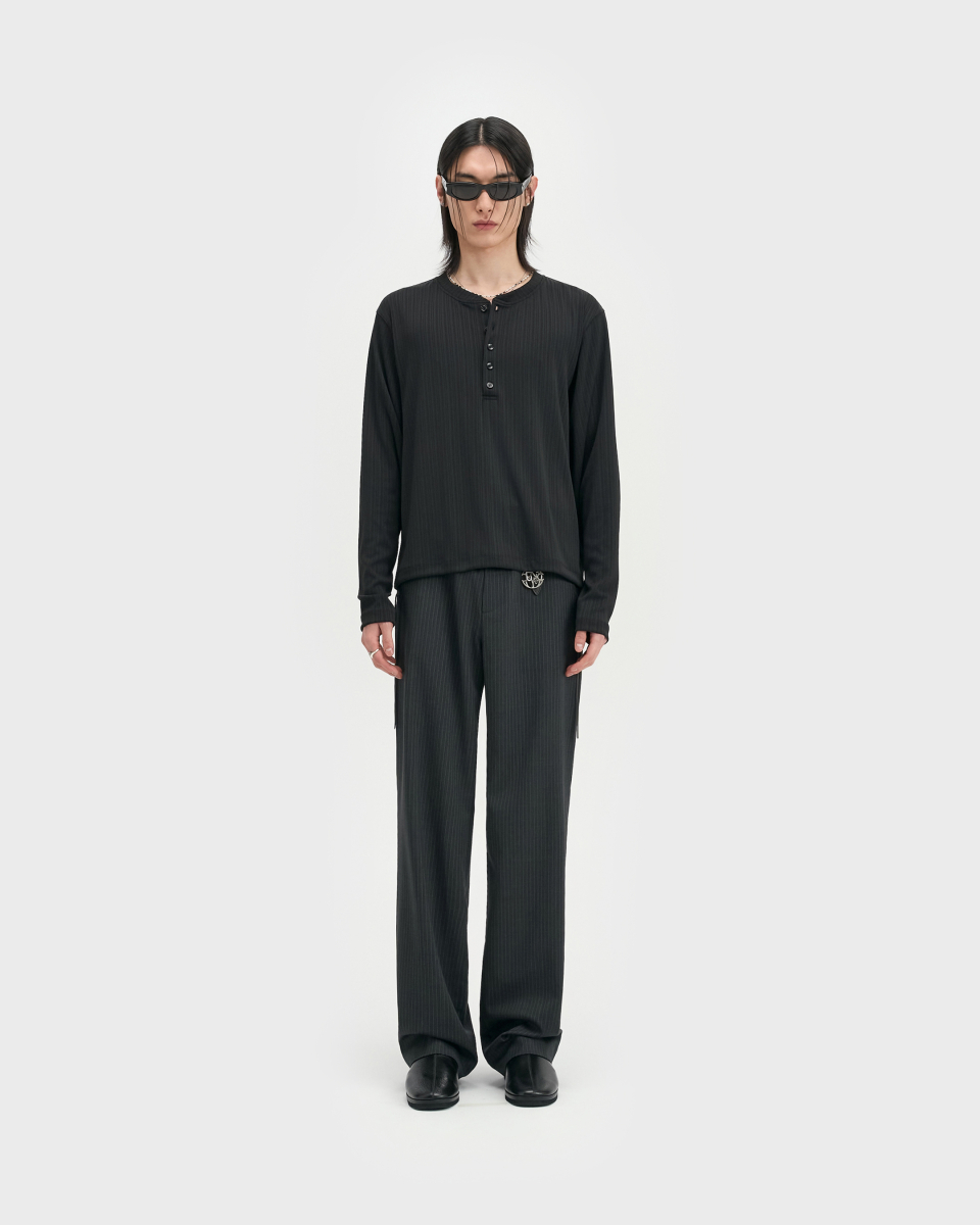 은은한 광택과 불규칙한 골지 텍스처가 돋보이는 헨리넥 티셔츠. 유연한 소재감이 편안한 착용감을 제공하며, 도시적인 선을 닮은 조직감이 단품은 물론 이너로서 정제된 무드를 완성하는 제품.