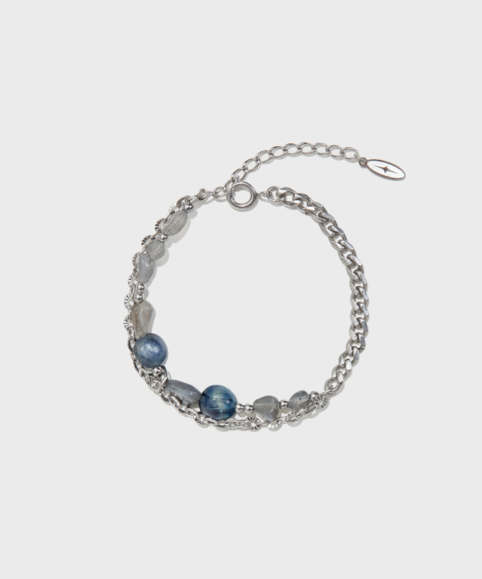 조약돌을 연상시키는 매끄러운 질감과 차가운 블루 톤을 표현한 네클리스. 각도에 따라 은은한 빛이 드러나며, 체인과 원석의 조합으로 미네랄한 분위기와 도시적인 균형을 동시에 갖춘 팔찌. ※천연 원석 특성상 색상의 개체 차이가 있을 수 있음.