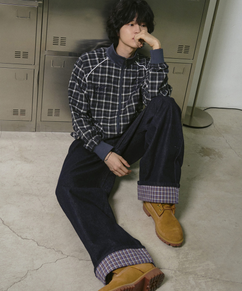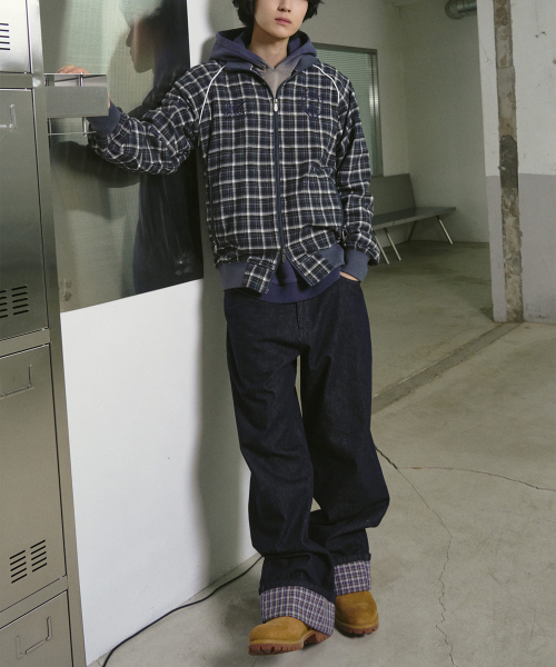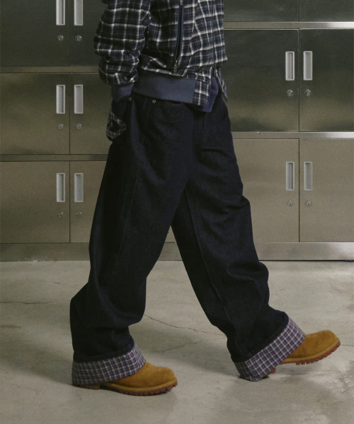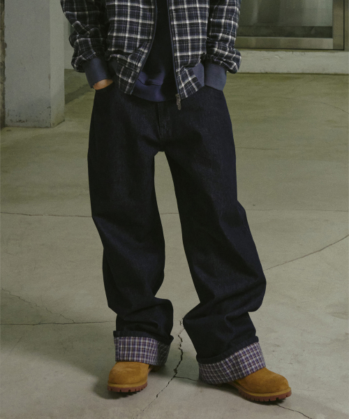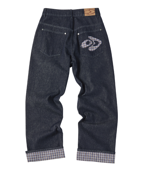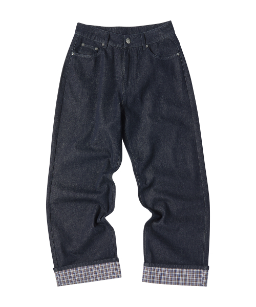 체크 롤업 데님 팬츠 인디고