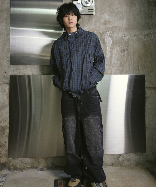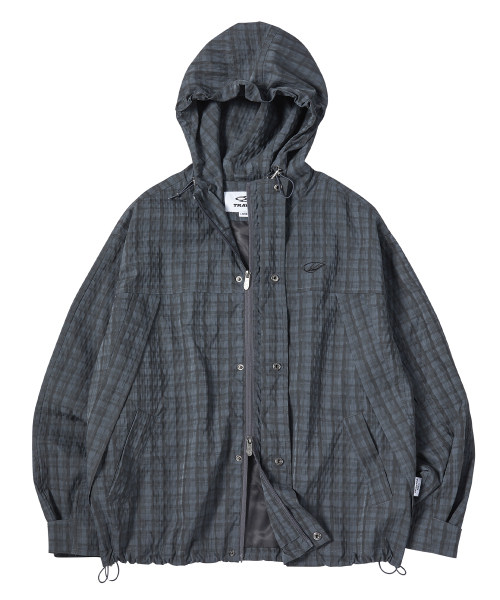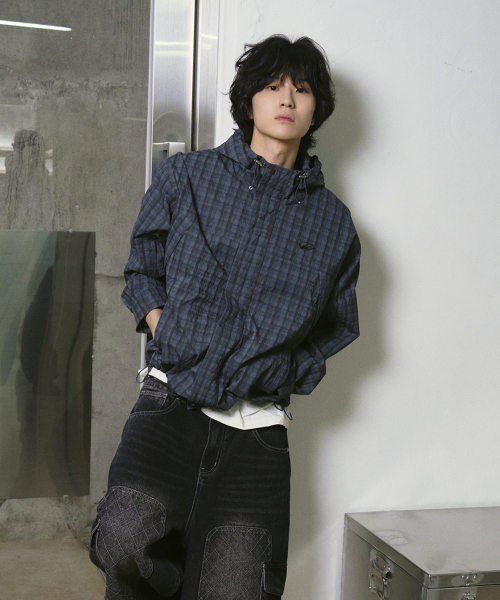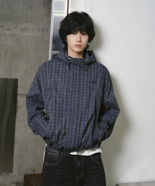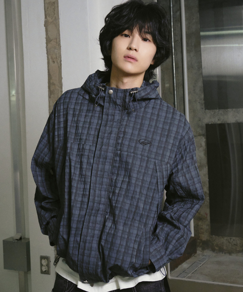 그레인 체크 후드 집업 자켓 다크 블루