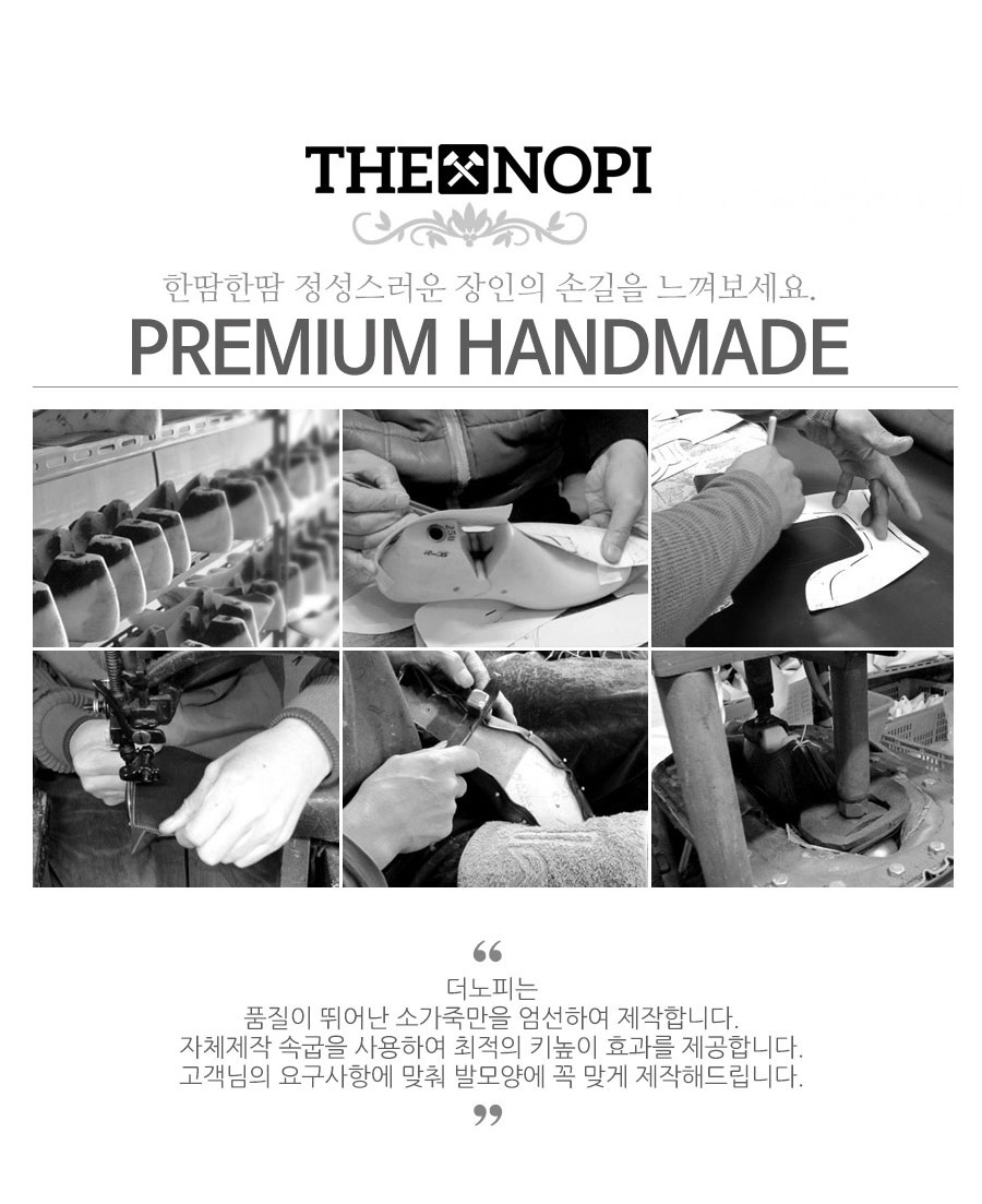 더노피(THENOPI)는 키 높이 수제화 브랜드로, 5~10cm 키높이 옥스퍼드, 스니커즈, 가죽 슬리퍼, 정장 구두 등을 생산하고 판매합니다.