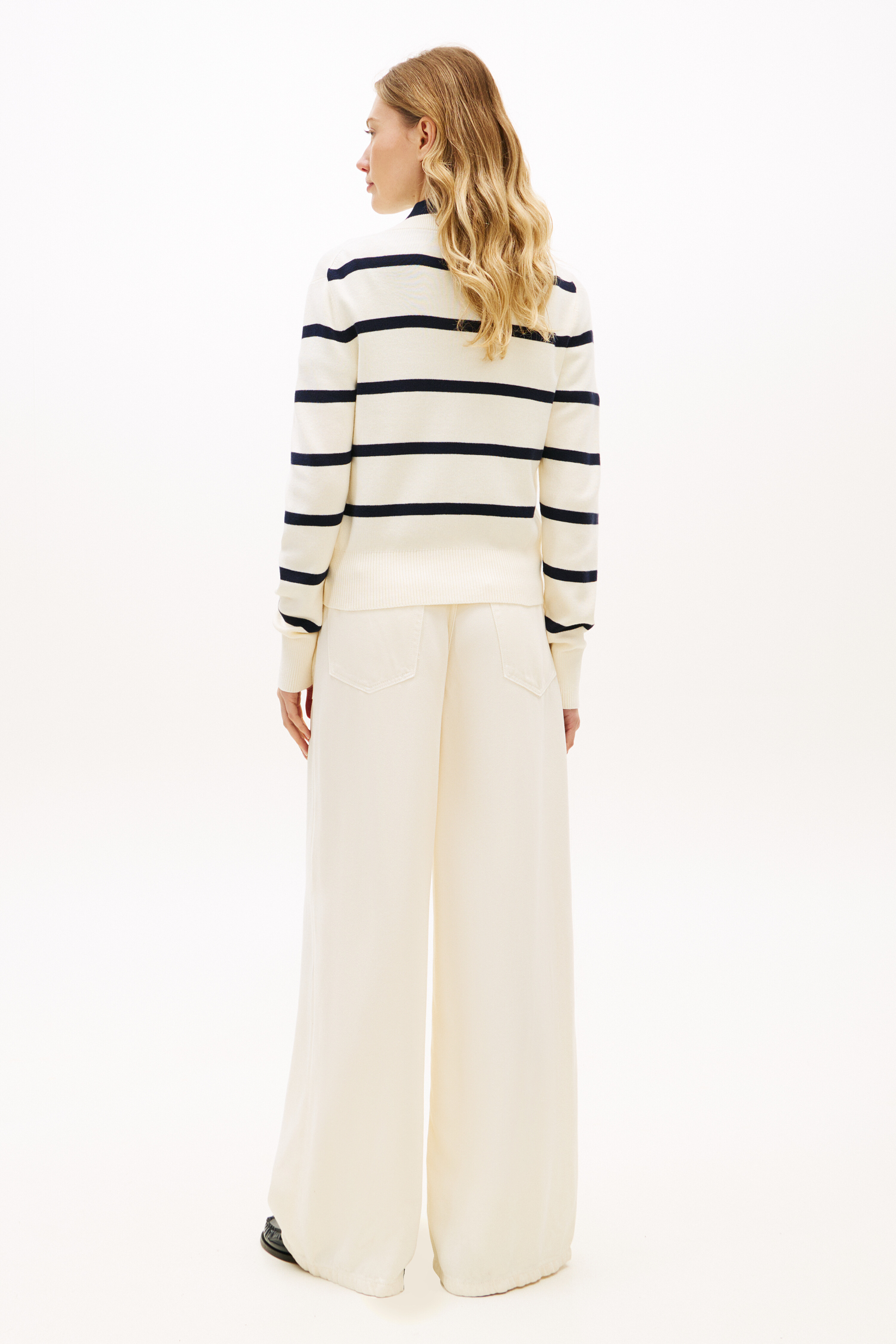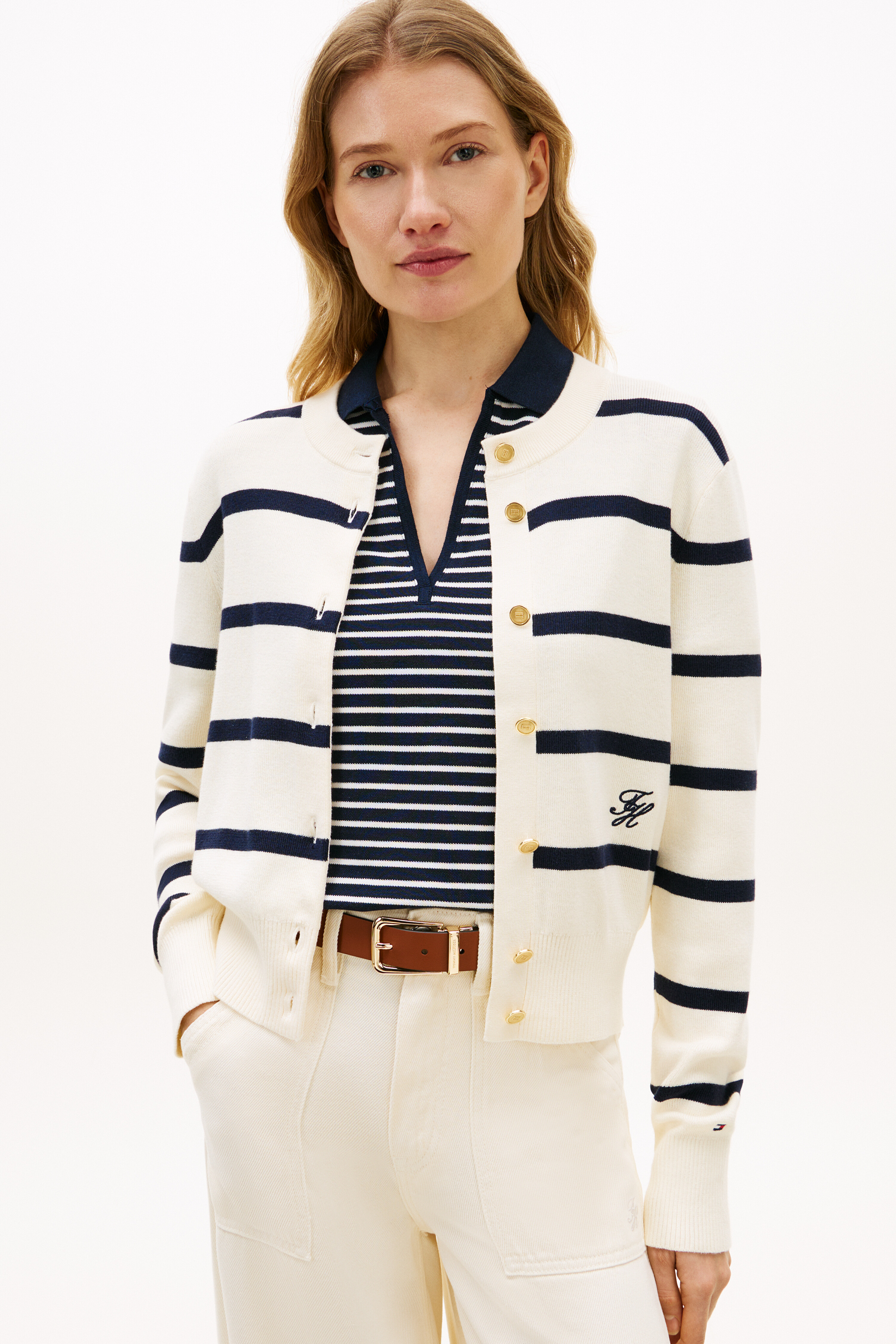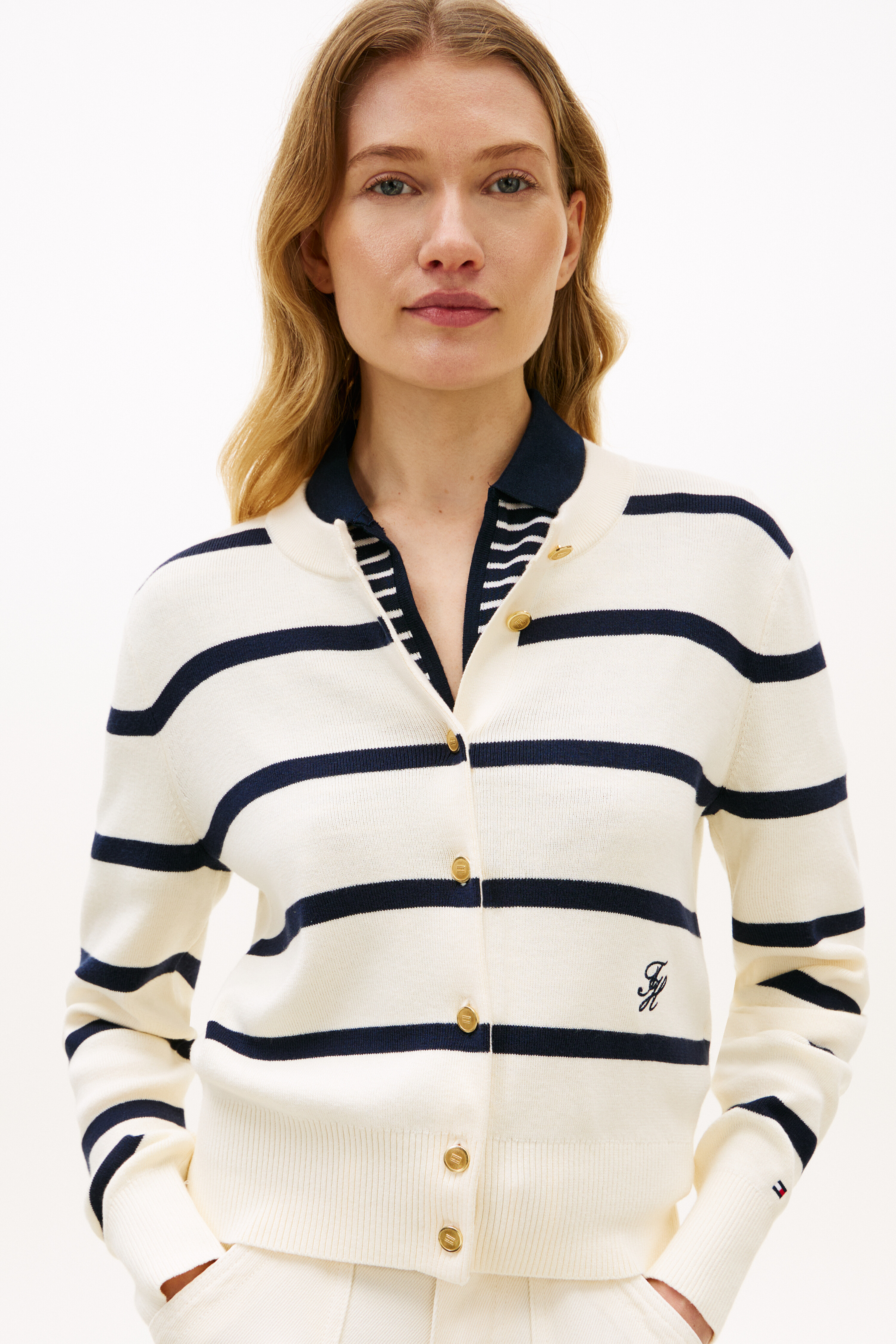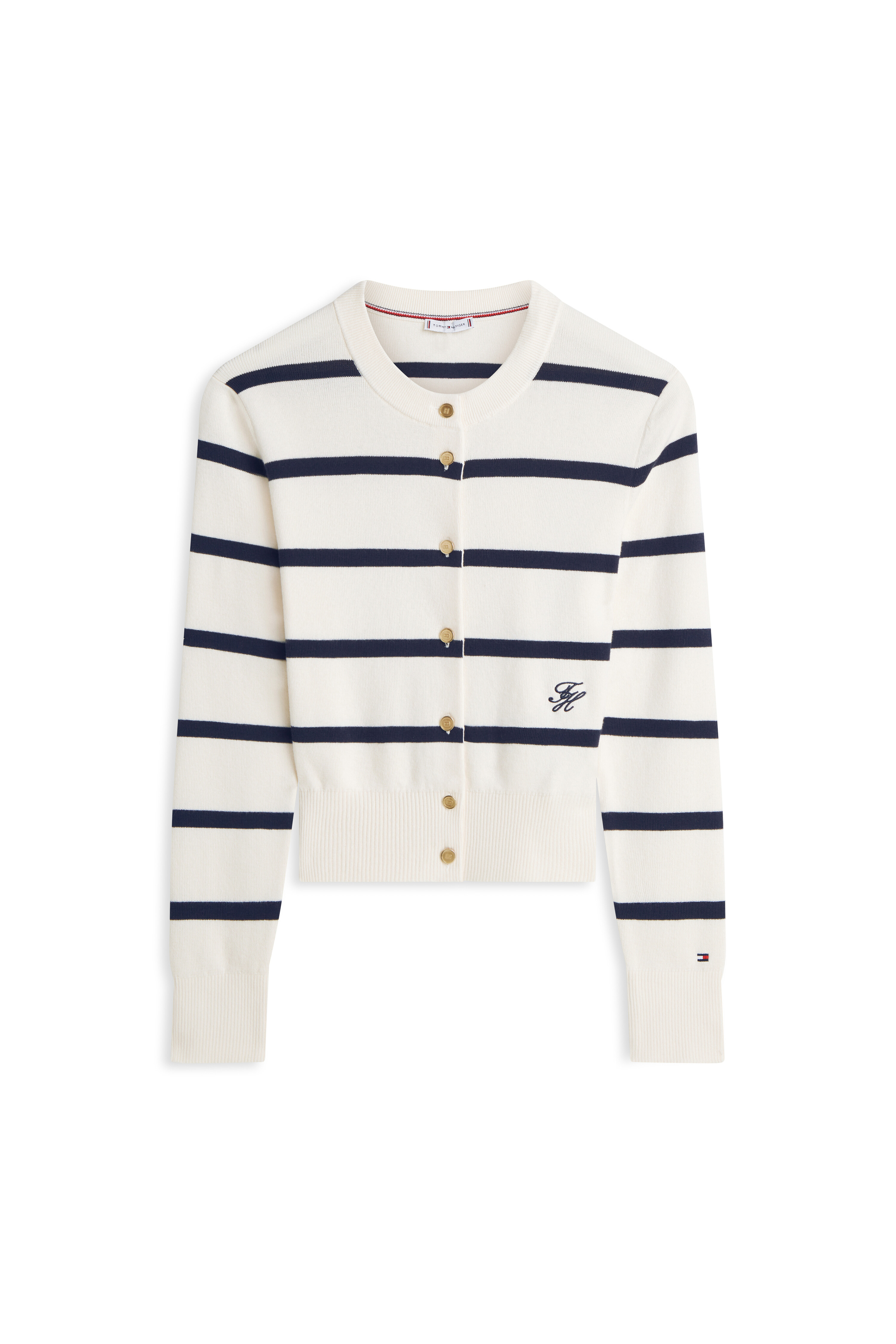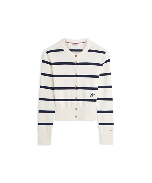 골드 톤 버튼 잠금과 골지 네크라인, 커프스, 밑단 디테일이 섬세한 마무리를 더하며, 스크립트 로고 자수가 은은한 포인트로 세련된 무드를 자아냅니다.
