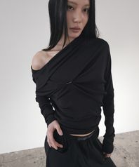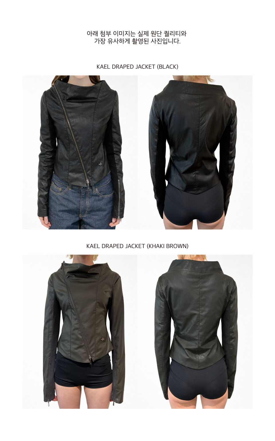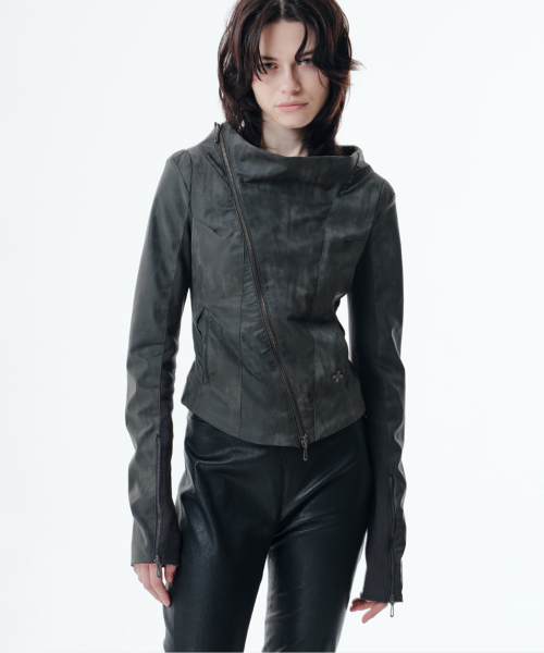 드레이프 카울넥과 사선 지퍼라인의 비정형 실루엣