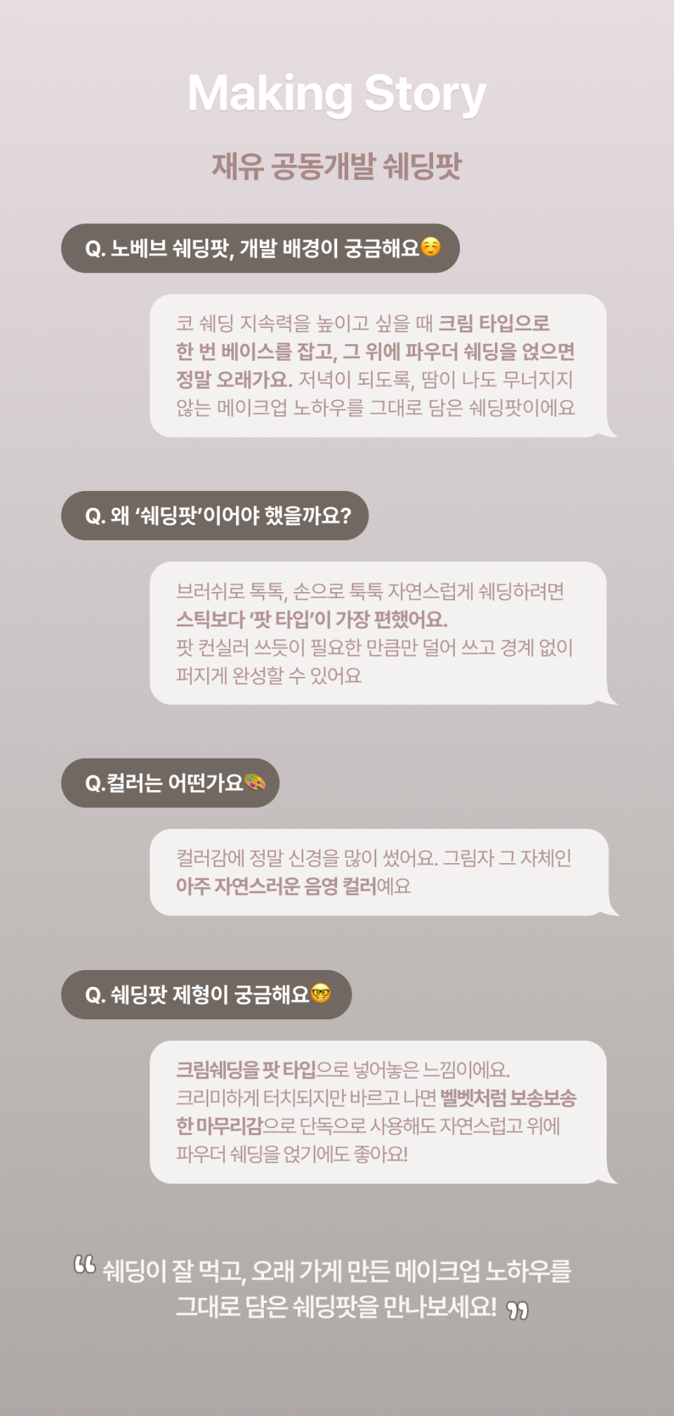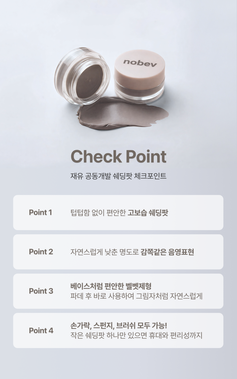 노베브(NOBEV)는 뷰티 크리에이터 '재유'와 함께 론칭한 브랜드로, 빠르게 변화하는 트렌드에 맞춘 제품을 고객에게 제공합니다. 지루한 뷰티 루틴에 새로운 자극과 영감을 불어넣어주는 제품으로 독보적인 무드를 선사합니다.