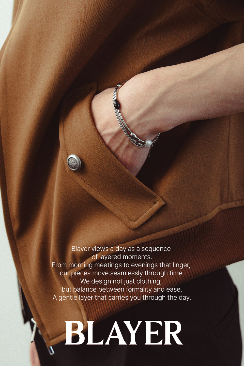 블레이어(BLAYER)는 단정함 속의 여유와 실용성에 담긴 감성, 절제된 디테일 속 특별함을 바탕으로 하루의 모든 순간을 하나의 선처럼 자연스럽게 연결하는 ‘하루의 레이어’를 제안하는 브랜드입니다.