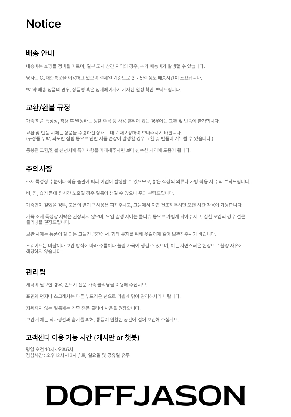 도프제이슨(DOFFJASON)은 가죽이라는 소재에 대한 이해를 기반으로 레더 가먼츠를 중심으로 디자인하는 브랜드입니다. 스타일에 구애받지 않고 오래 입을수록 가치를 더하는 타임리스 디자인을 추구하고, 절제된 디테일과 뛰어난 퀄리티의 아이템을 선보입니다.