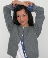CHECK SHIRT POINTED KNIT CARDIGAN GREY