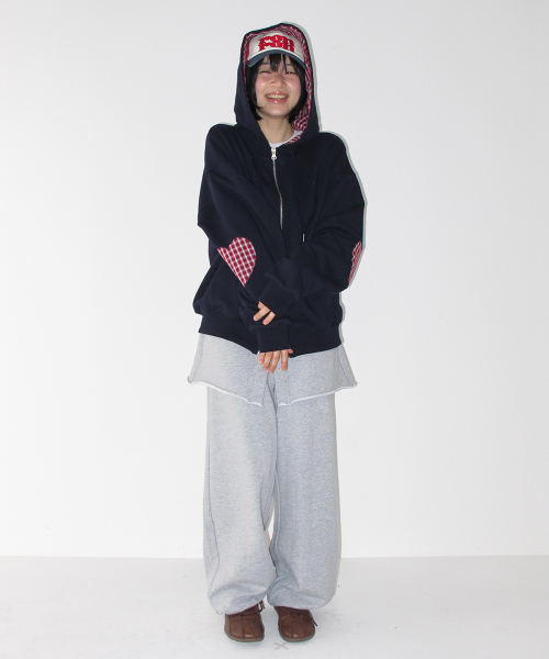 CHECK PATCH HOODIE ZIP UP GREY