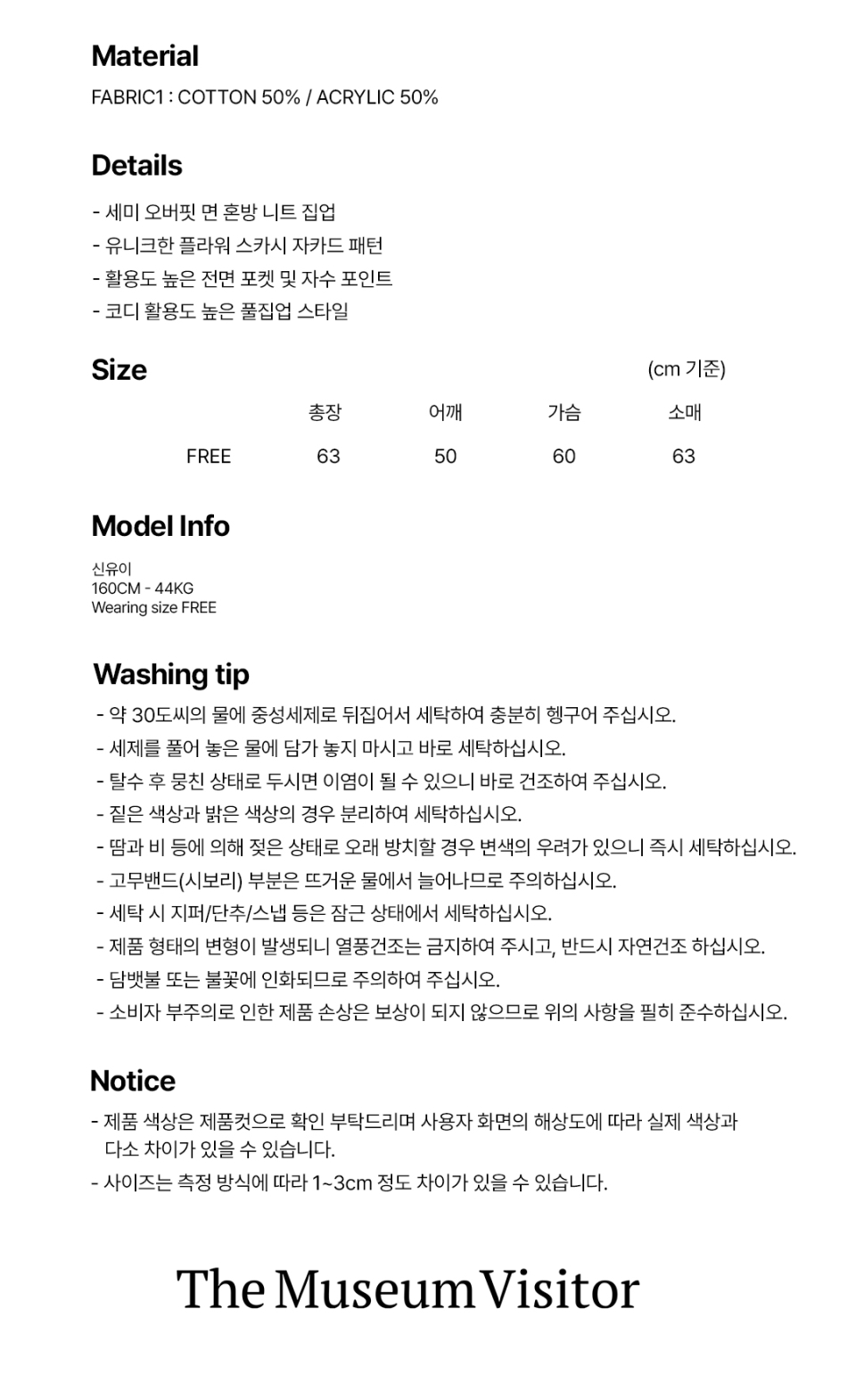 더뮤지엄비지터(THE MUSEUM VISITOR)는 2016년 디렉터 박문수의 독일 베를린 여정에서부터 시작된 브랜드입니다. 거리와 사람들에게서 느낀 자유와 사랑, 행복, 예술이 담긴 도시에서 받은 영감을 많은 이들에게 전하고자 합니다. 주로 꽃과 하트, 자연, 아이들이 디자인적 요소로 나타나며, 수작업이 가미된 차별적인 디자인 덕에 많은 마니아층의 사랑을 받고 있습니다.