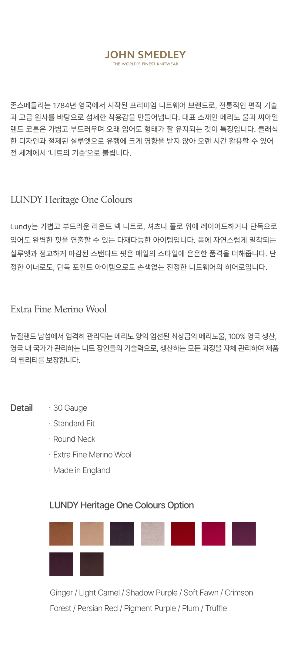 존 스메들리(JOHN SMEDLEY)는 250여 년의 역사를 가진 명품 니트 브랜드로, 전 세계에서 가장 얇은 니트를 선보이며 왕실 인증서를 보유하고 있습니다.