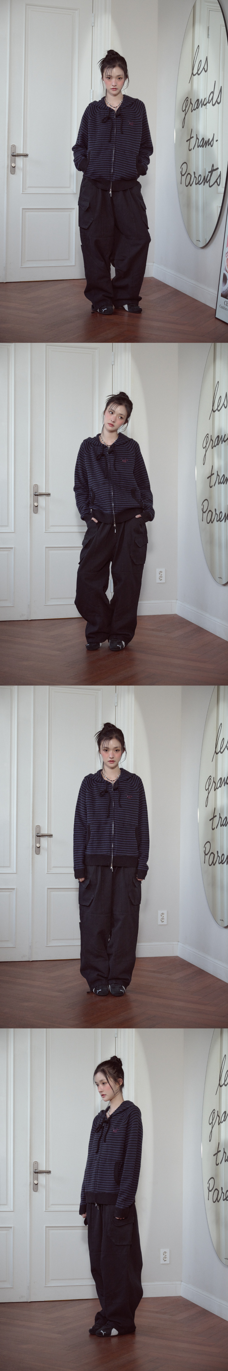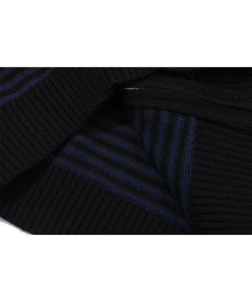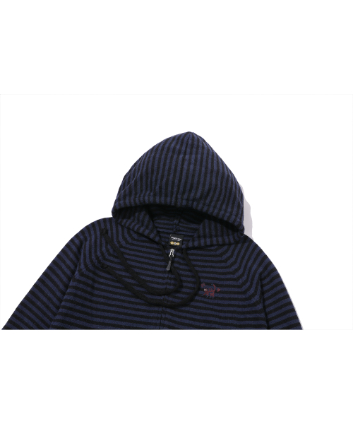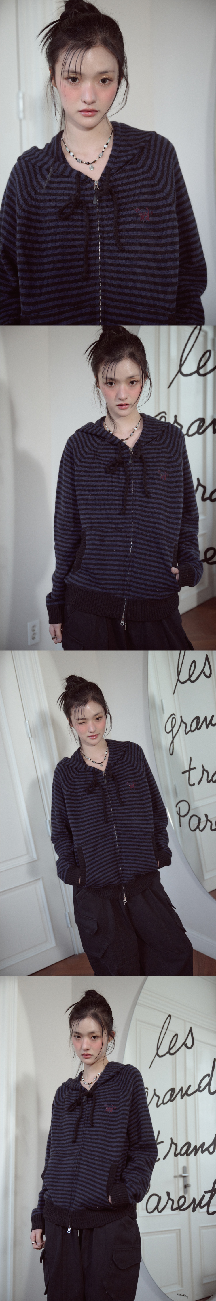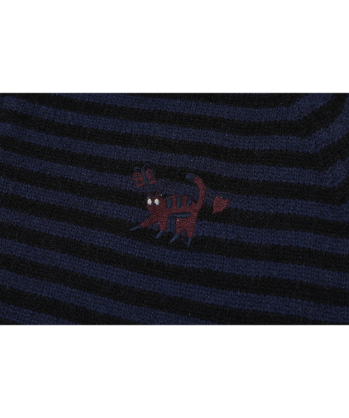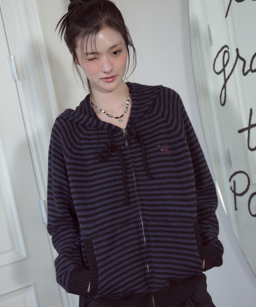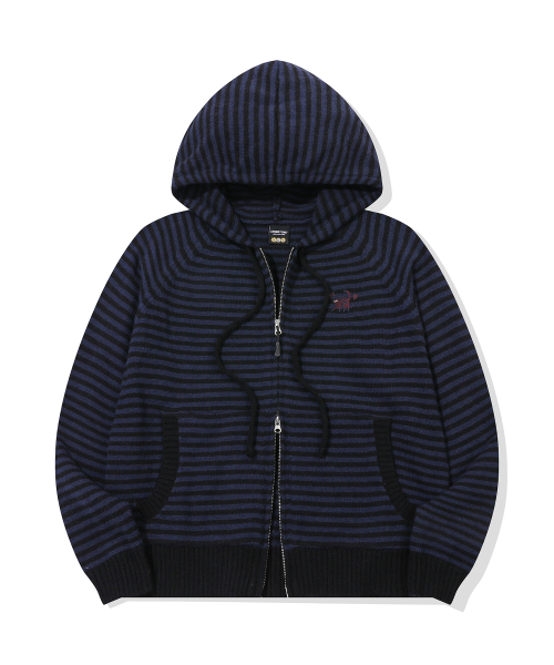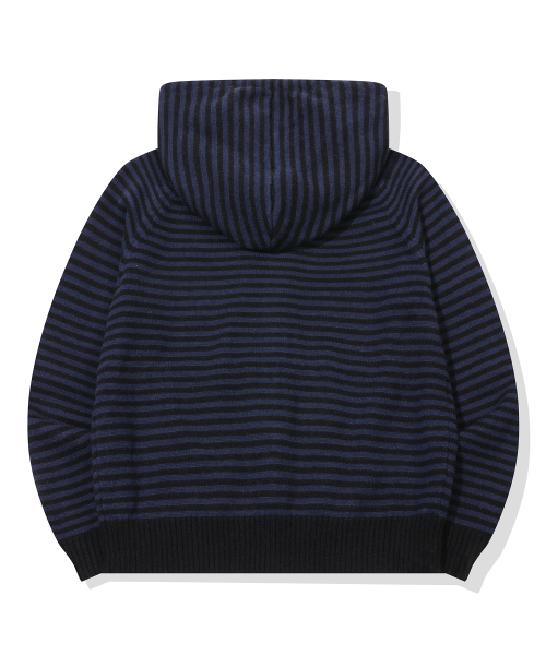캣 스트라이프 후드 니트 집업 네이비