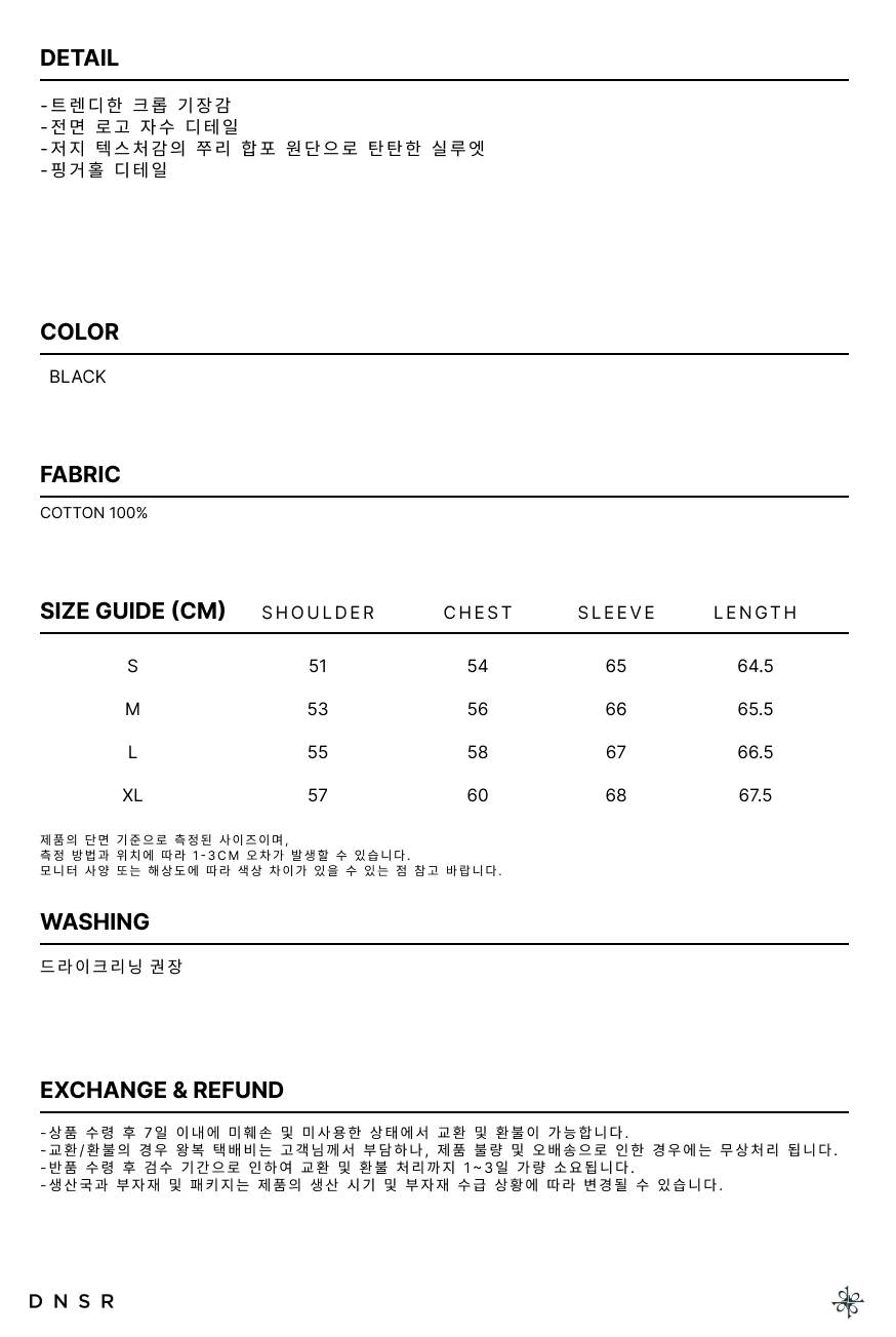 디앤에스알(DNSR)는 'Do New things, Something to realize'라는 슬로건을 바탕으로, 동시대에 흐름에 발 맞춰 항상 독창적이고 새로운 시도를 하고 있습니다. 디앤에스알의 DNA는 현대 복식을 기반으로 하는 오리지널리티의 견고한 테일러링을 고수하며 시대의 흐름을 읽고 변화하는 무드와 스타일링을 제안하는 스트릿 캐주얼 웨어입니다.