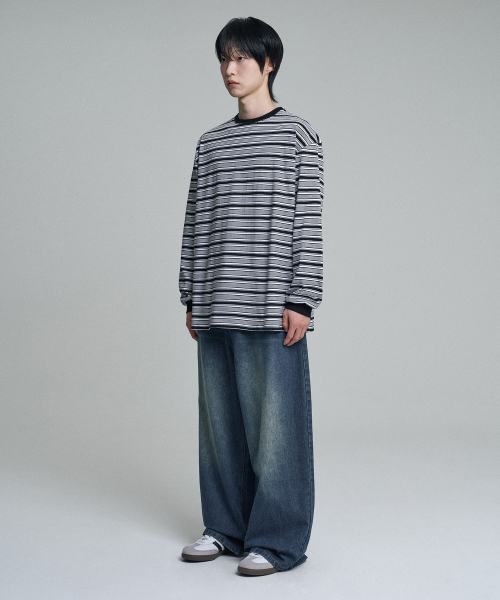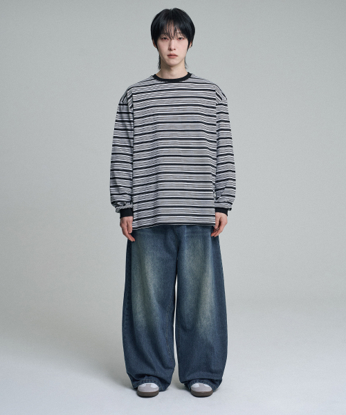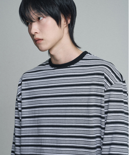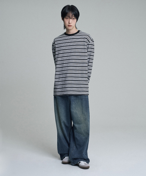 오버핏 스트라이프 롱슬리브 티셔츠 그레이