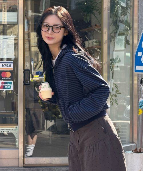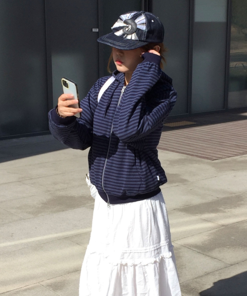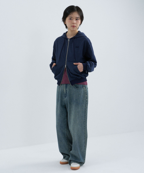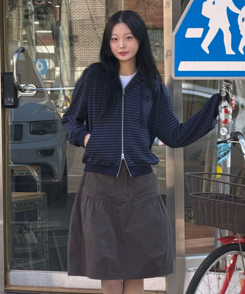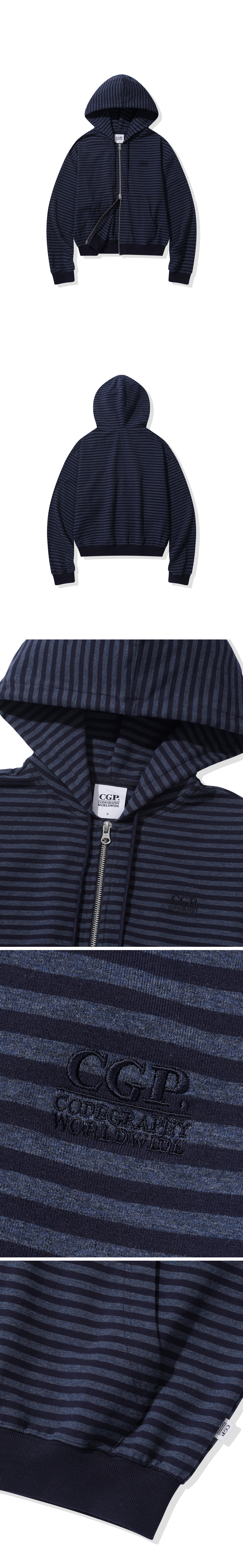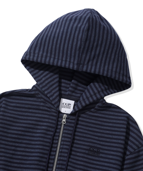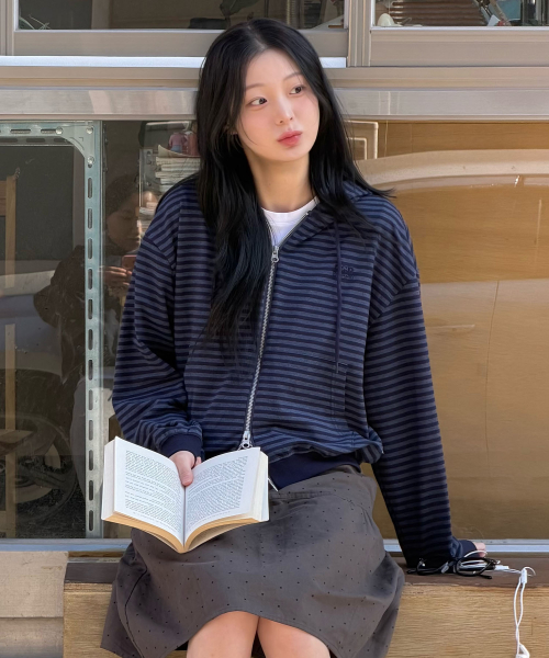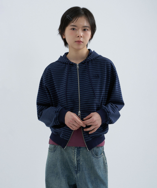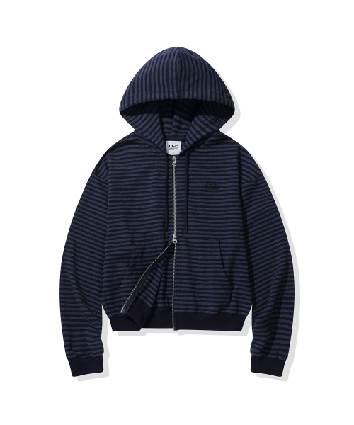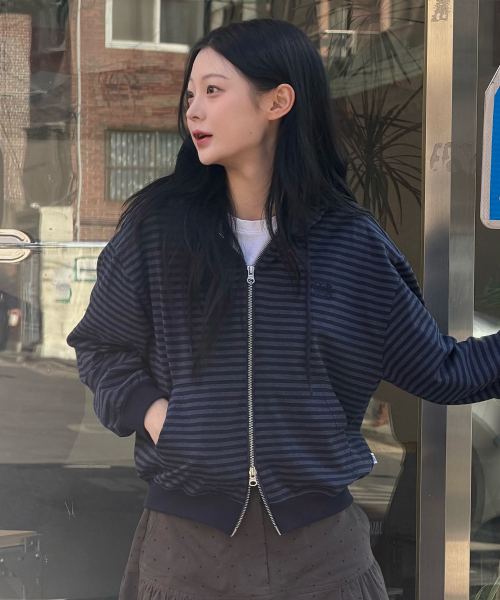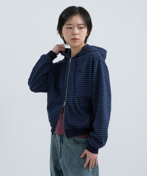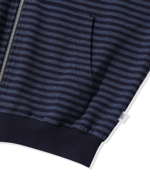 (우먼) 라이트 웨이트 스트라이프 후드 집업-다크 네이비