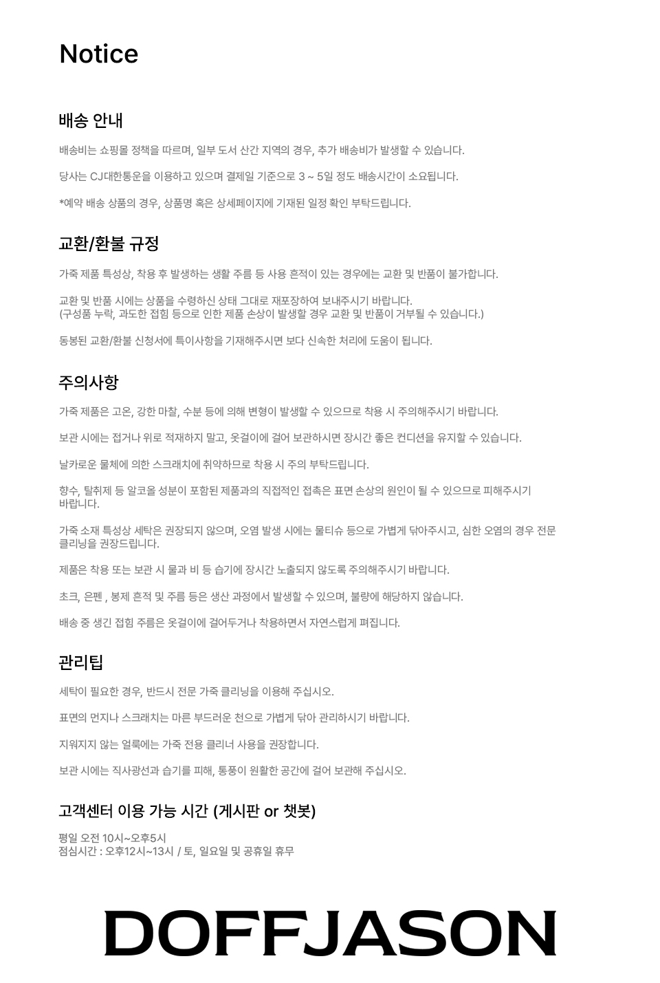 도프제이슨(DOFFJASON)은 가죽이라는 소재에 대한 이해를 기반으로 레더 가먼츠를 중심으로 디자인하는 브랜드입니다. 스타일에 구애받지 않고 오래 입을수록 가치를 더하는 타임리스 디자인을 추구하고, 절제된 디테일과 뛰어난 퀄리티의 아이템을 선보입니다.