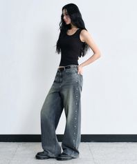 우먼즈 스터드 와이드 데님 팬츠 [러스티 블루]