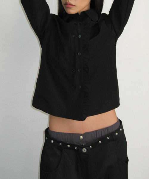 프릴 레이스 더블 버튼 클래식 베이직 긴팔 블라우스 셔츠 [블랙]