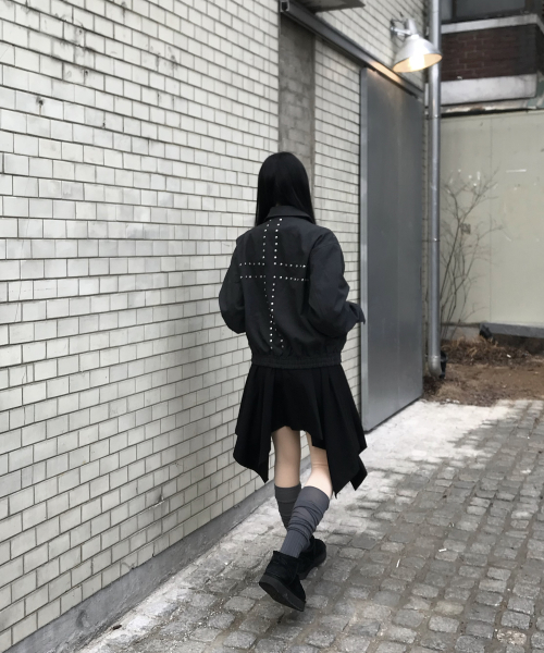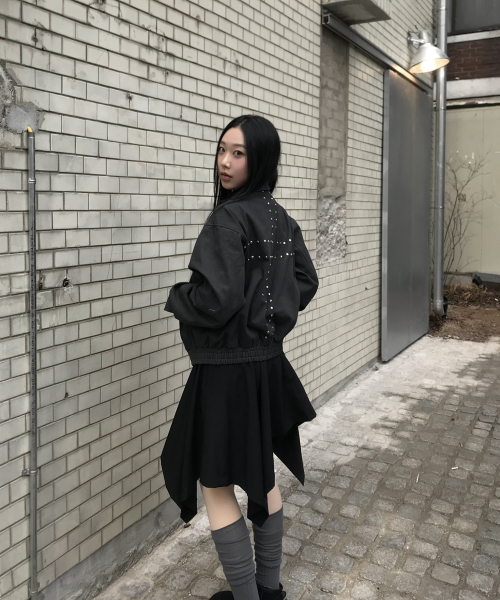 하이넥 스탠다드 스트랩 비조 포인트 블루종 집업 자켓 [블랙]
