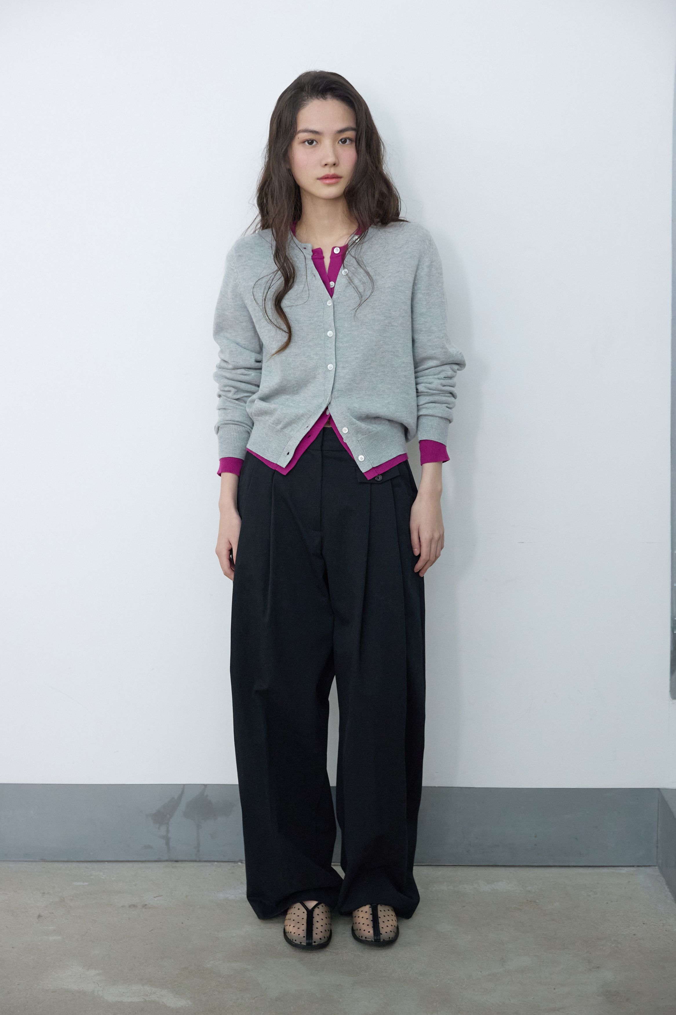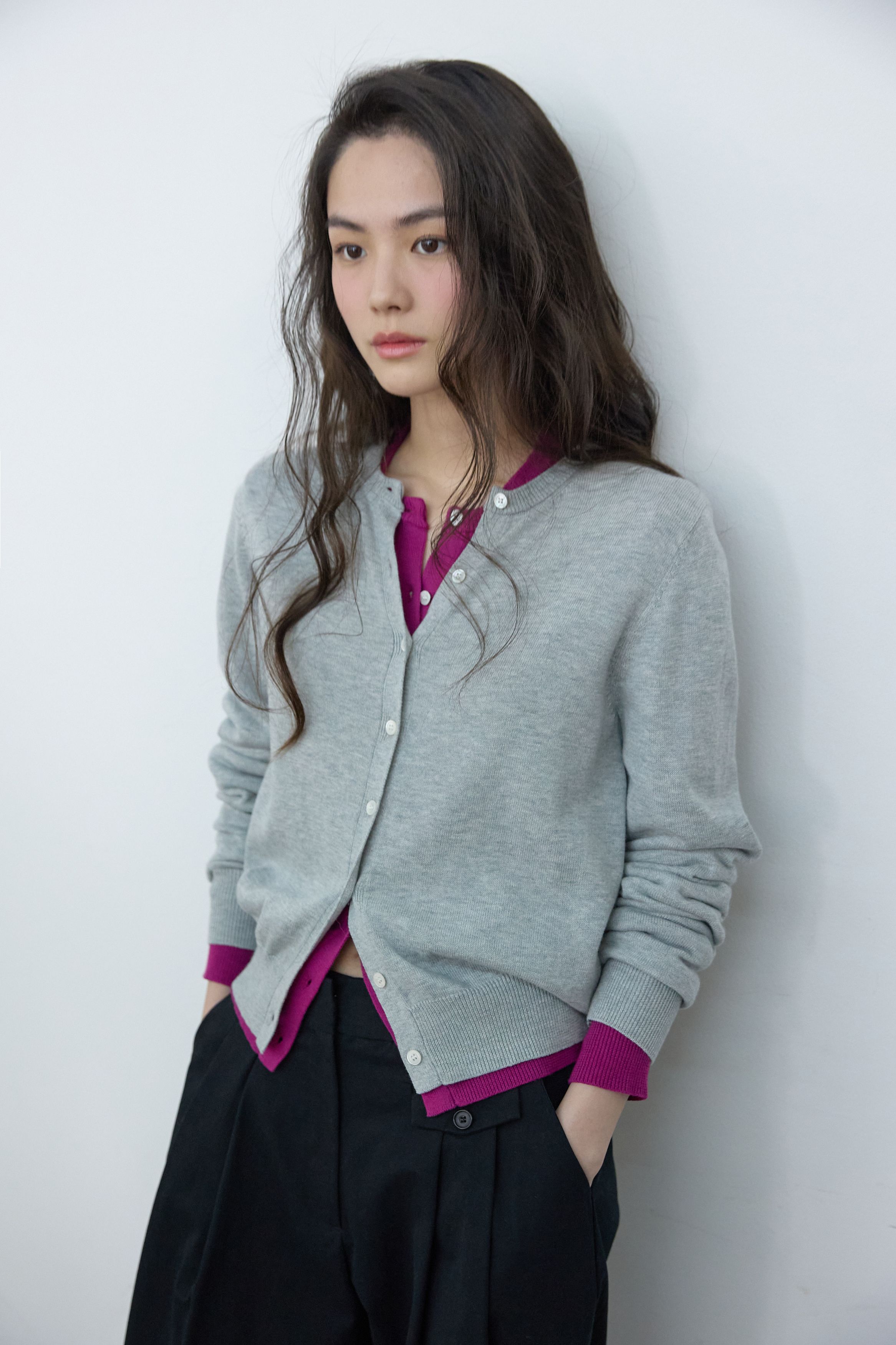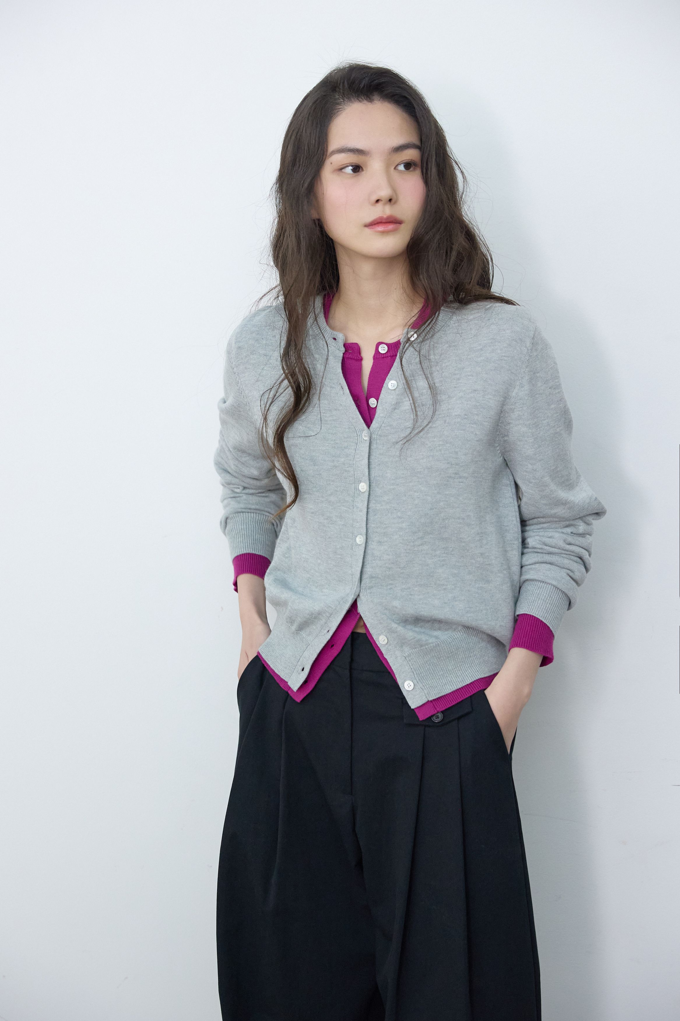 에센셜 라운드 니트 가디건 플럼