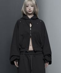 Hotfix Detail Cropped Two-Way Zip Hoodie (Charcoal)
