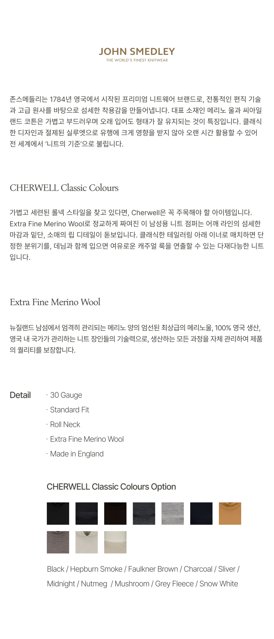 존 스메들리(JOHN SMEDLEY)는 250여 년의 역사를 가진 명품 니트 브랜드로, 전 세계에서 가장 얇은 니트를 선보이며 왕실 인증서를 보유하고 있습니다.