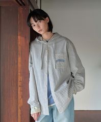 아치 로고 후드 체크 셔츠 베이지