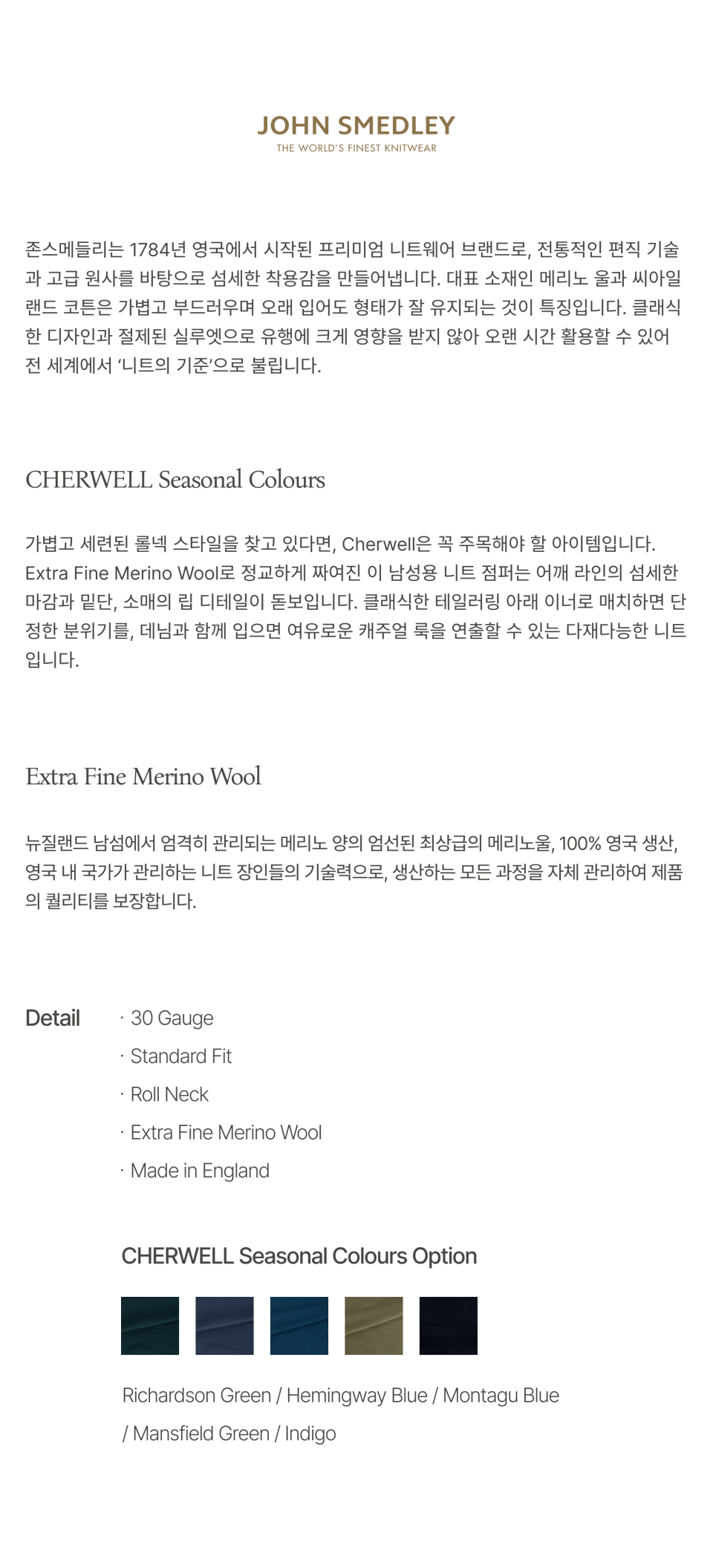 존 스메들리(JOHN SMEDLEY)는 250여 년의 역사를 가진 명품 니트 브랜드로, 전 세계에서 가장 얇은 니트를 선보이며 왕실 인증서를 보유하고 있습니다.