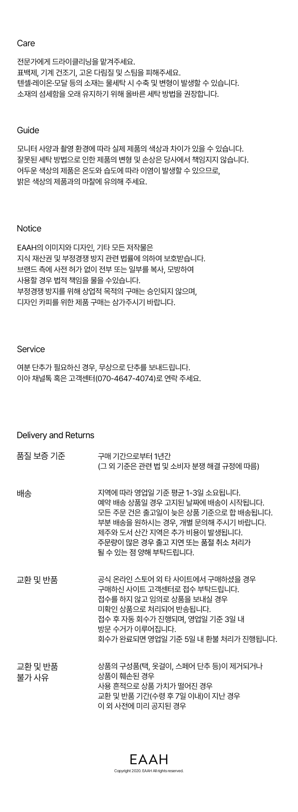 이아(EAAH)는 미니멀리즘에 현대적인 감각을 더해 본질에 집중한 컬렉션을 제안하는 브랜드입니다. 안락한 착용감이 정서적인 편안함으로 연결되는 경험에 초점을 두고, 시간이 흐를수록 깊어지는 아이템을 선보입니다.