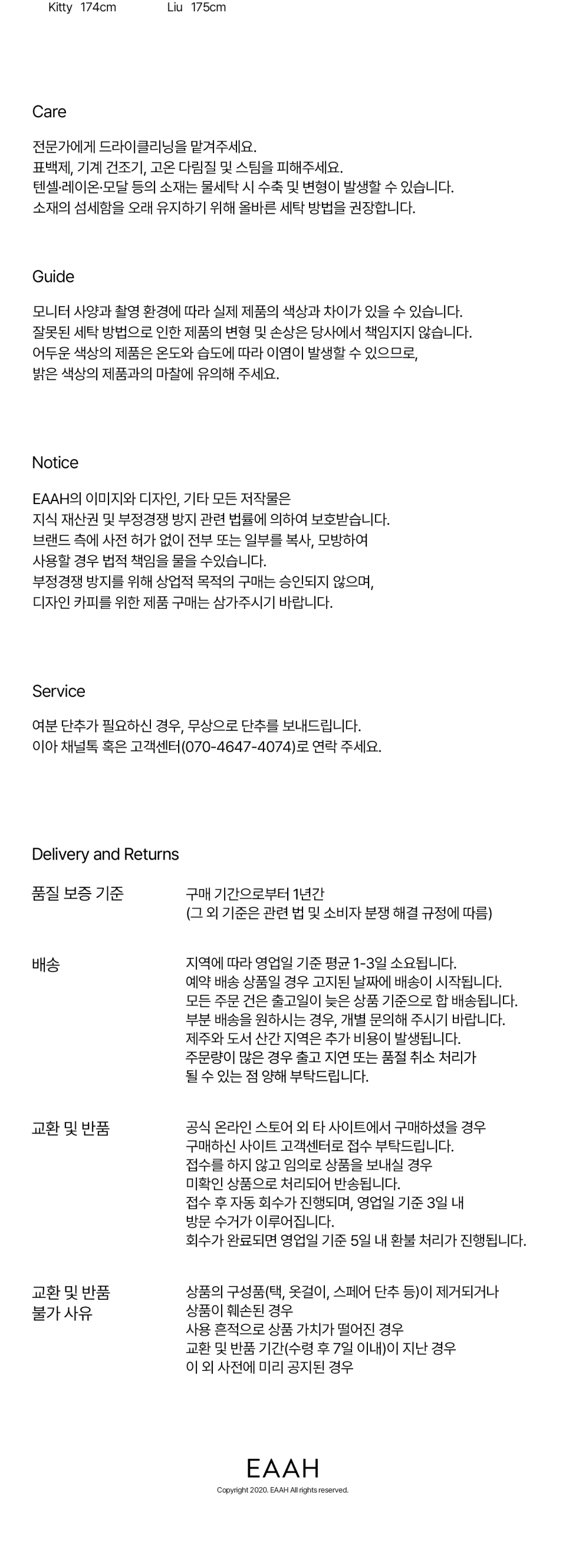 이아(EAAH)는 미니멀리즘에 현대적인 감각을 더해 본질에 집중한 컬렉션을 제안하는 브랜드입니다. 안락한 착용감이 정서적인 편안함으로 연결되는 경험에 초점을 두고, 시간이 흐를수록 깊어지는 아이템을 선보입니다.