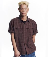 텍스쳐 크롭 롤업 체크 반팔 셔츠 - 브라운
