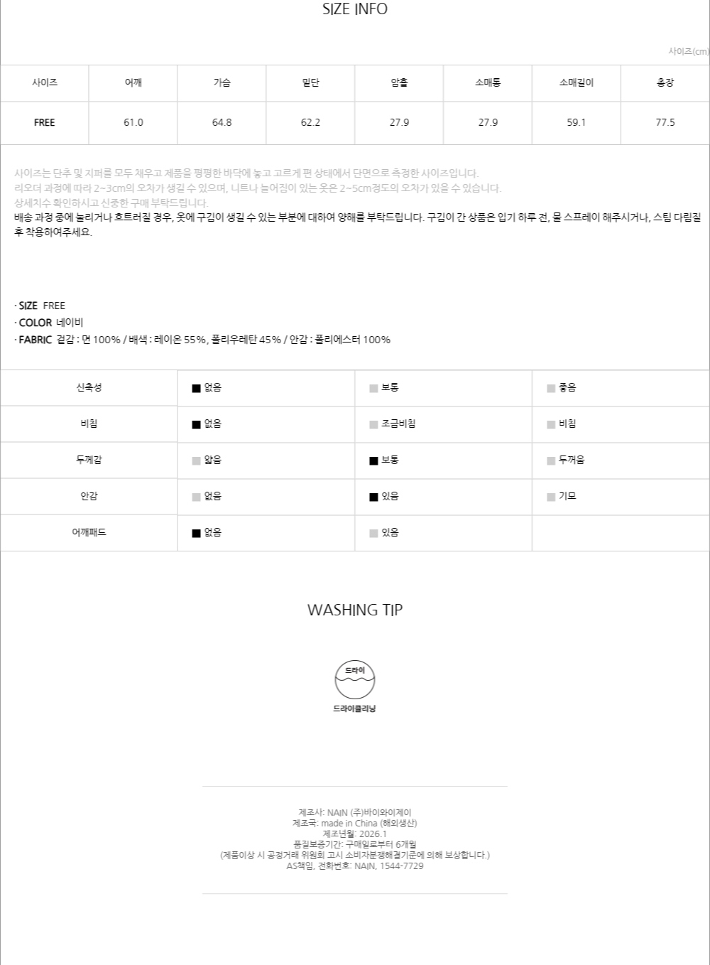 착용 및 세탁시 마찰이나 습기에 의해 이염이 발생할 수 있습니다.