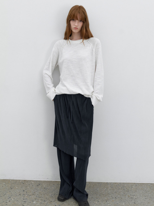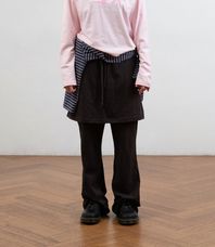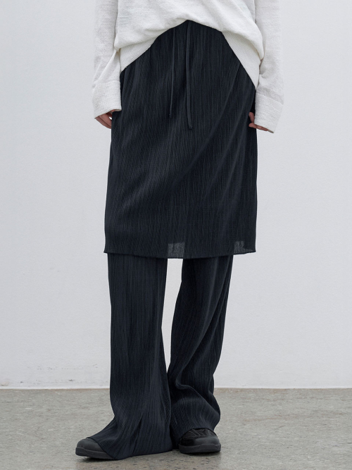 플리츠 스커트가 레이어드된 팬츠로, 허리 밴드와 스트링으로 편안하게 착용 가능합니다.