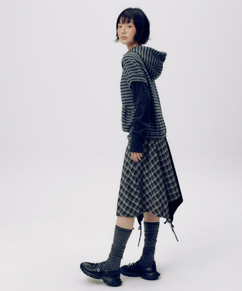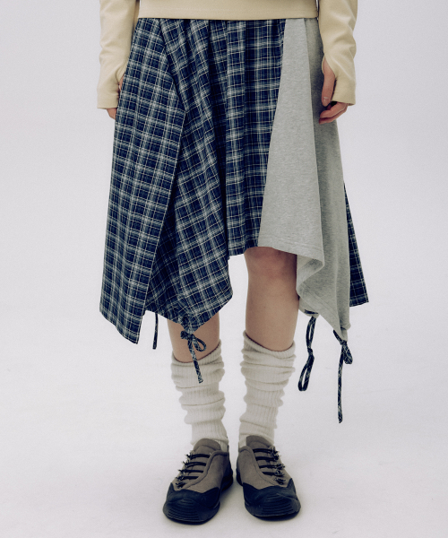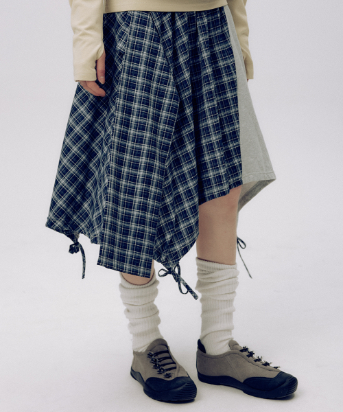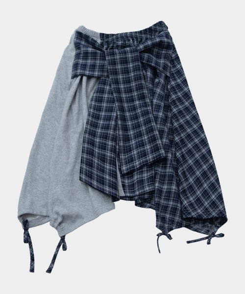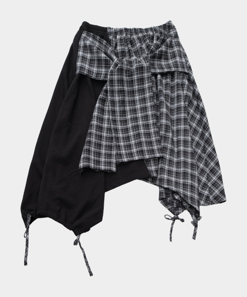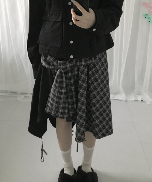 체크 언발란스 타이 업 스트랩 플레어 레이어드 미디 랩 스커트 _ 2COLOR