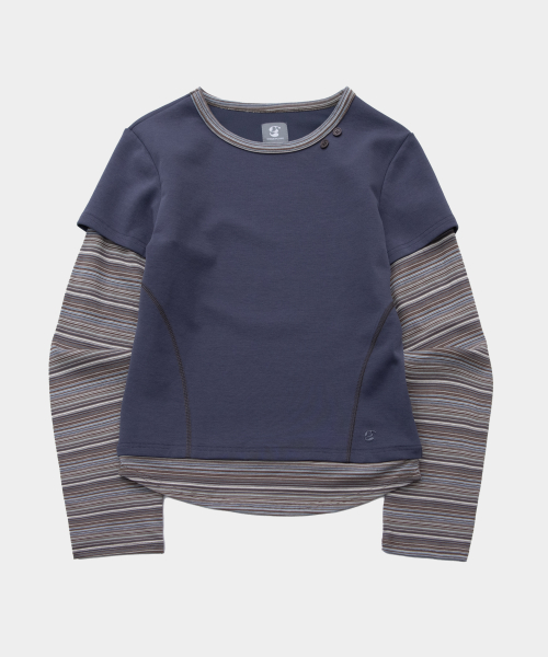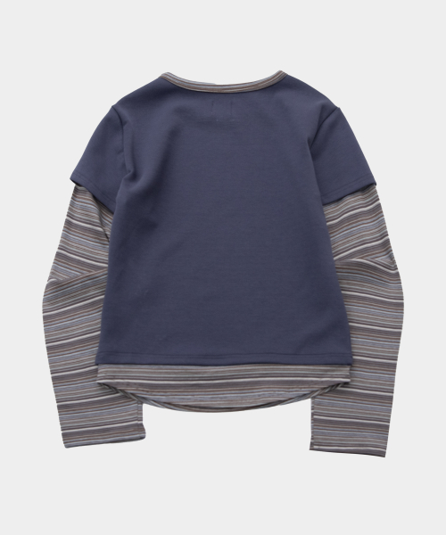 스트라이프 배색 스티치 포인트 레이어드 롱 슬리브 티셔츠 [네이비]