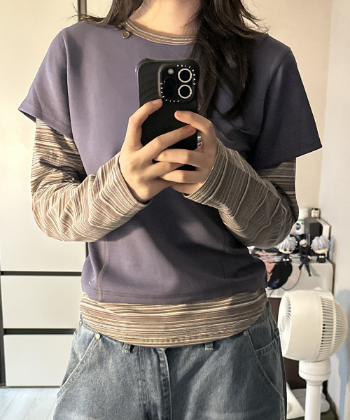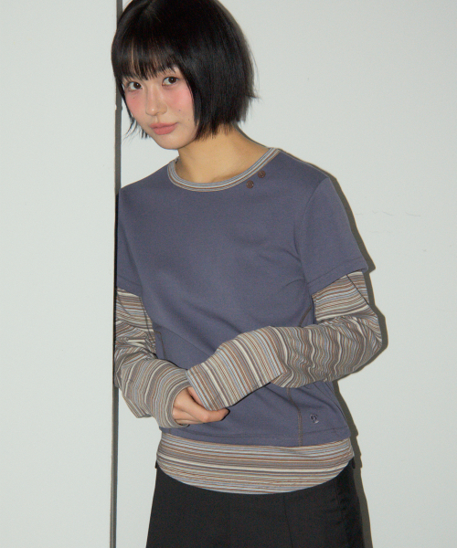스트라이프 배색 스티치 포인트 레이어드 롱 슬리브 티셔츠 [차콜]