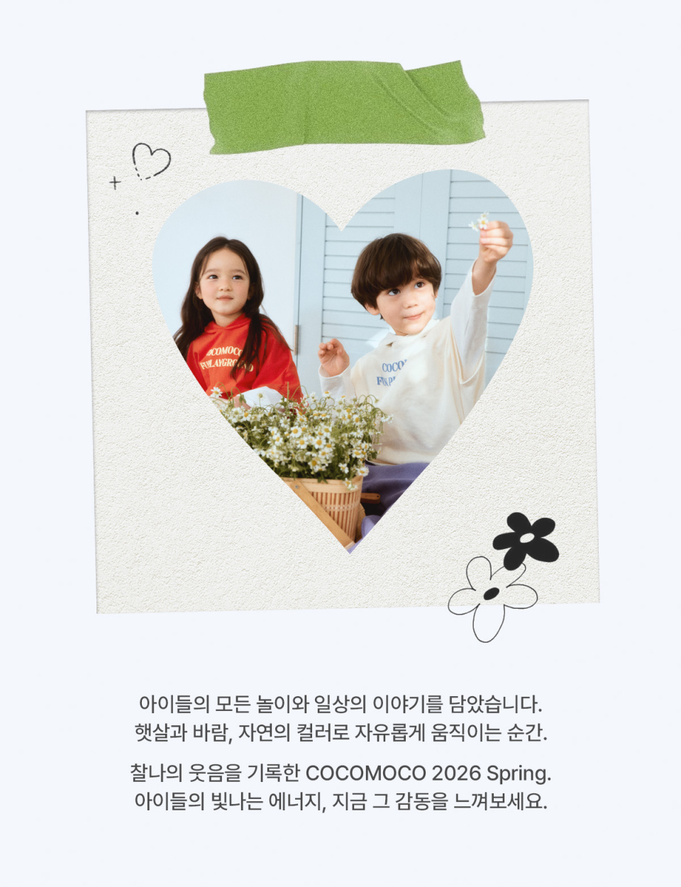 코코모코(COCOMOCO)는 아이들의 찰나의 순간들을 함께 기록할 수 있도록, 엄마와 아이 또는 가족이 함께 입을 수 있는 다양한 아이템들을 매 시즌 구성하여 일상에 스며드는 옷을 디자인하는 브랜드입니다.