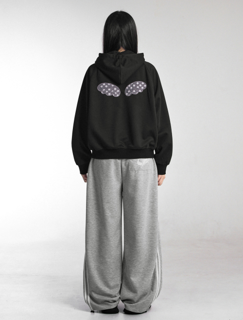 엔젤 자수패치 하이넥 오버핏 후드집업 블랙
