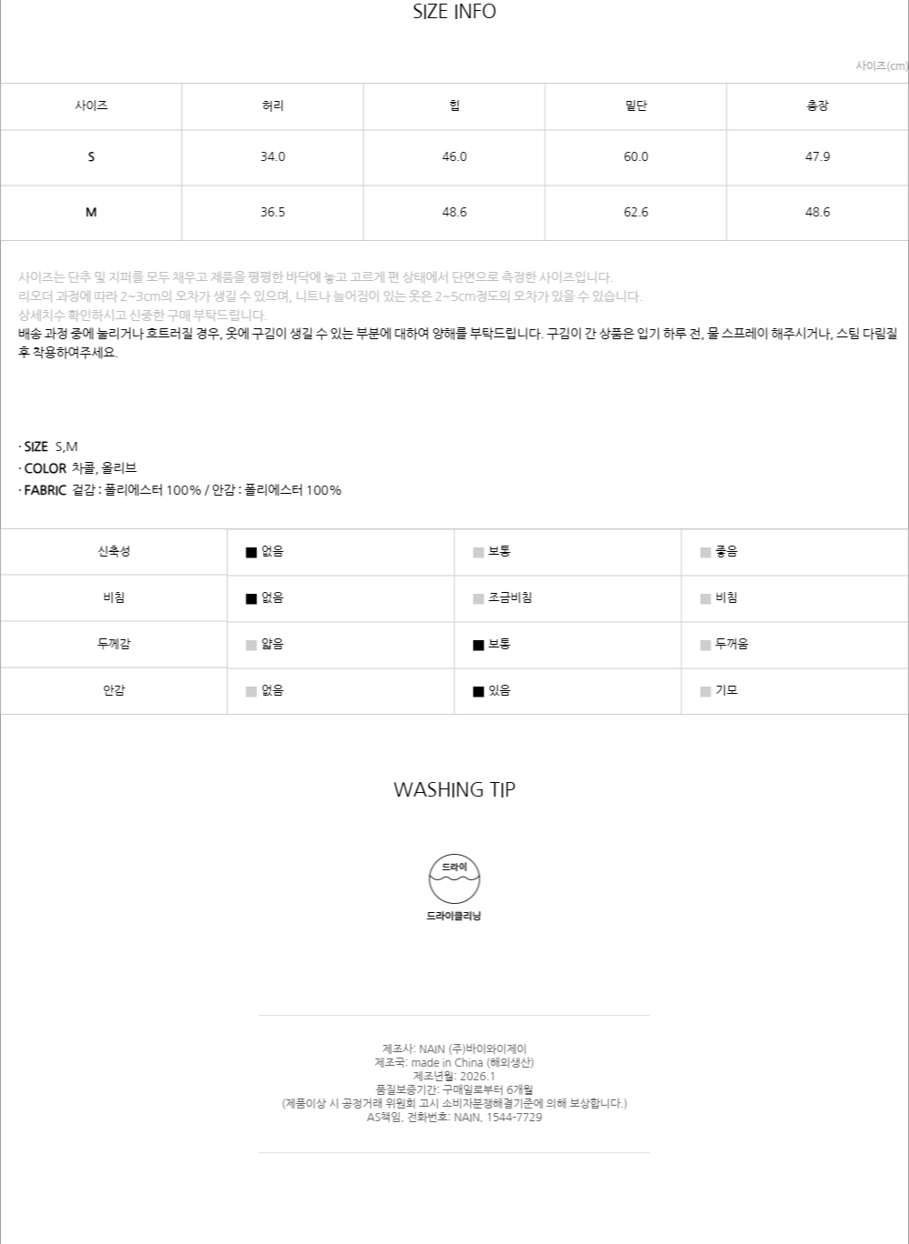 **원단 특성상 착용 및 세탁시 마찰이나 습기에 의해 이염이 발생할 수 있습니다.